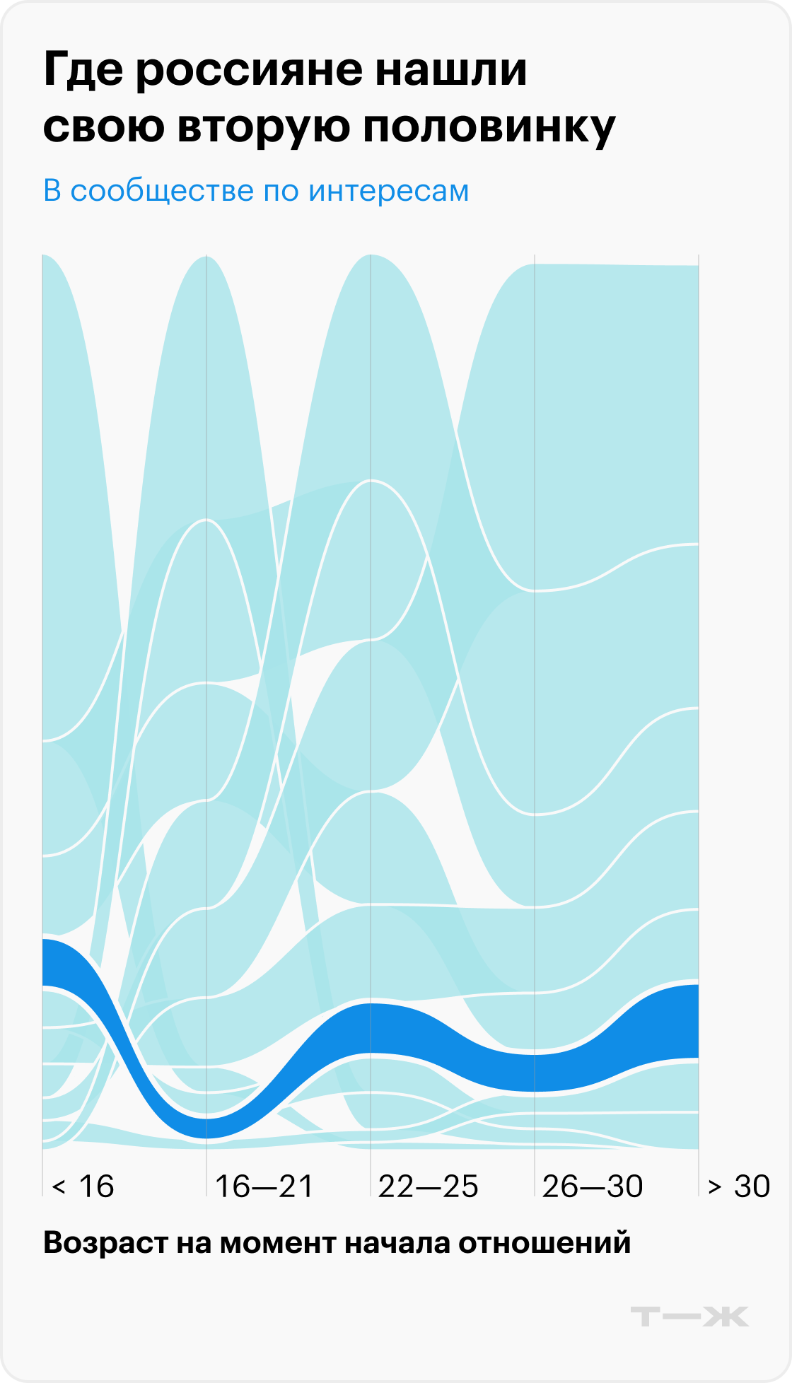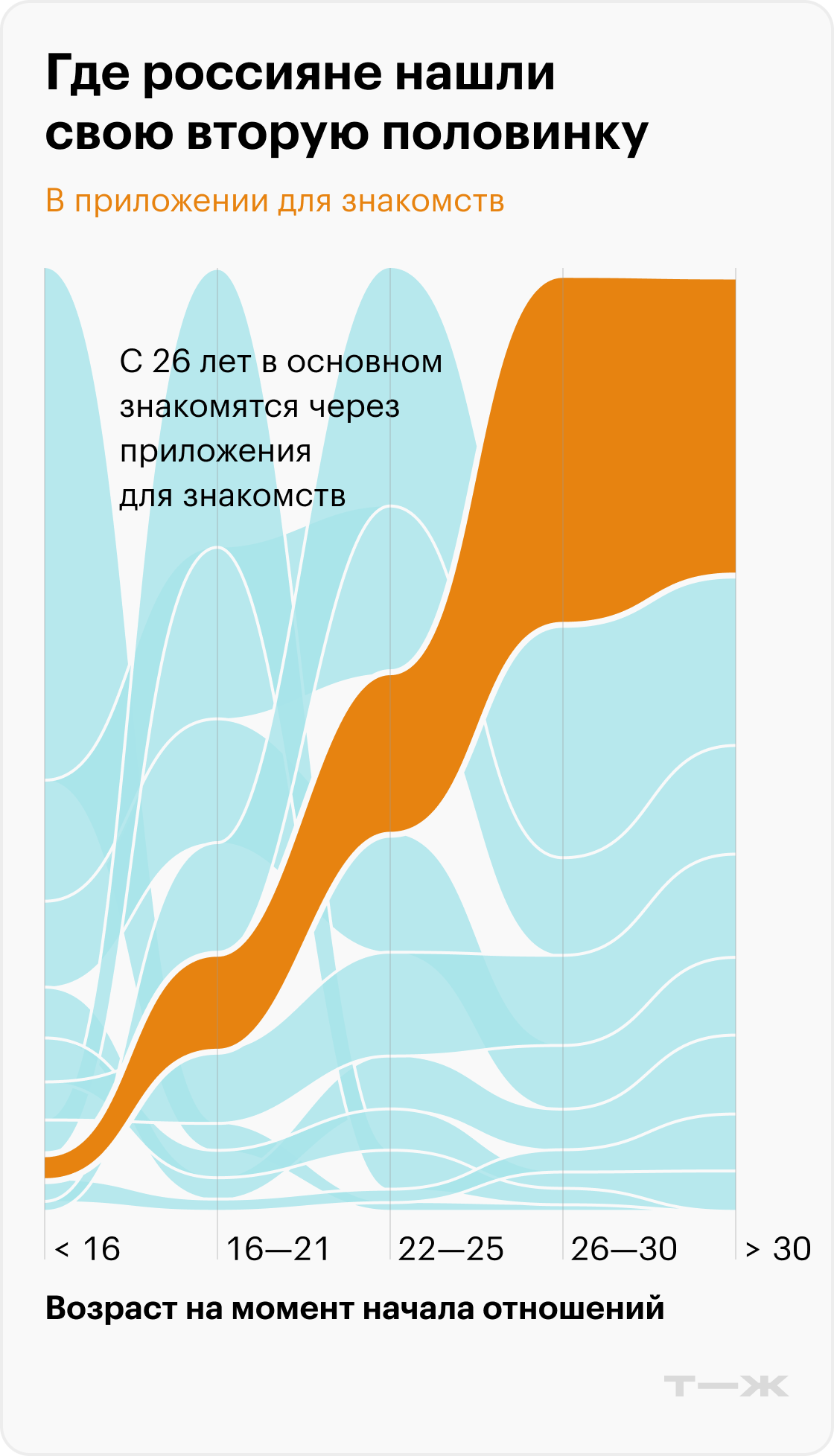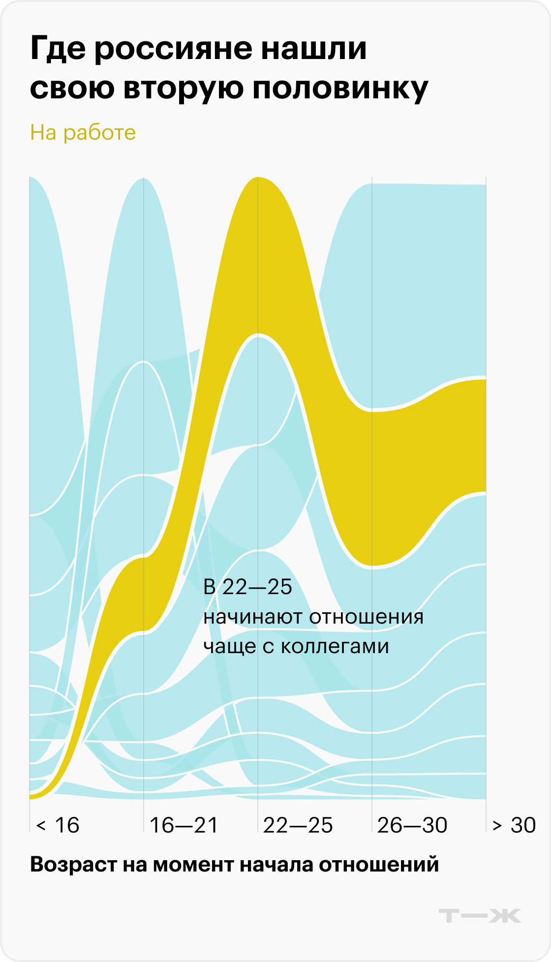 Оказалось, что в 2010—2019 годы отношения в этой возрастной группе обычно появлялись благодаря работе: около 30%. На втором месте по популярности оказались знакомства благодаря общим друзьям: около 20%. Сегодняшняя молодежь 22—30 лет чаще всего заводит отношения с помощью дейтинговых приложений — 39%. Работа опустилась на второе место по популярности, стабилизировавшись на уровне около 20%.