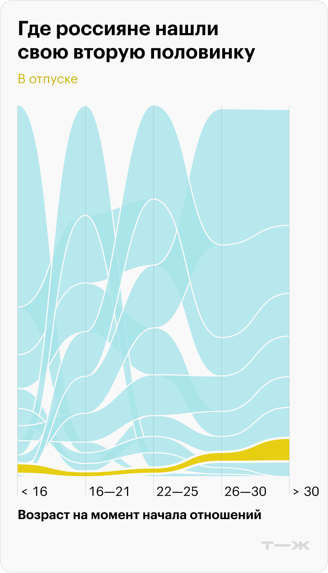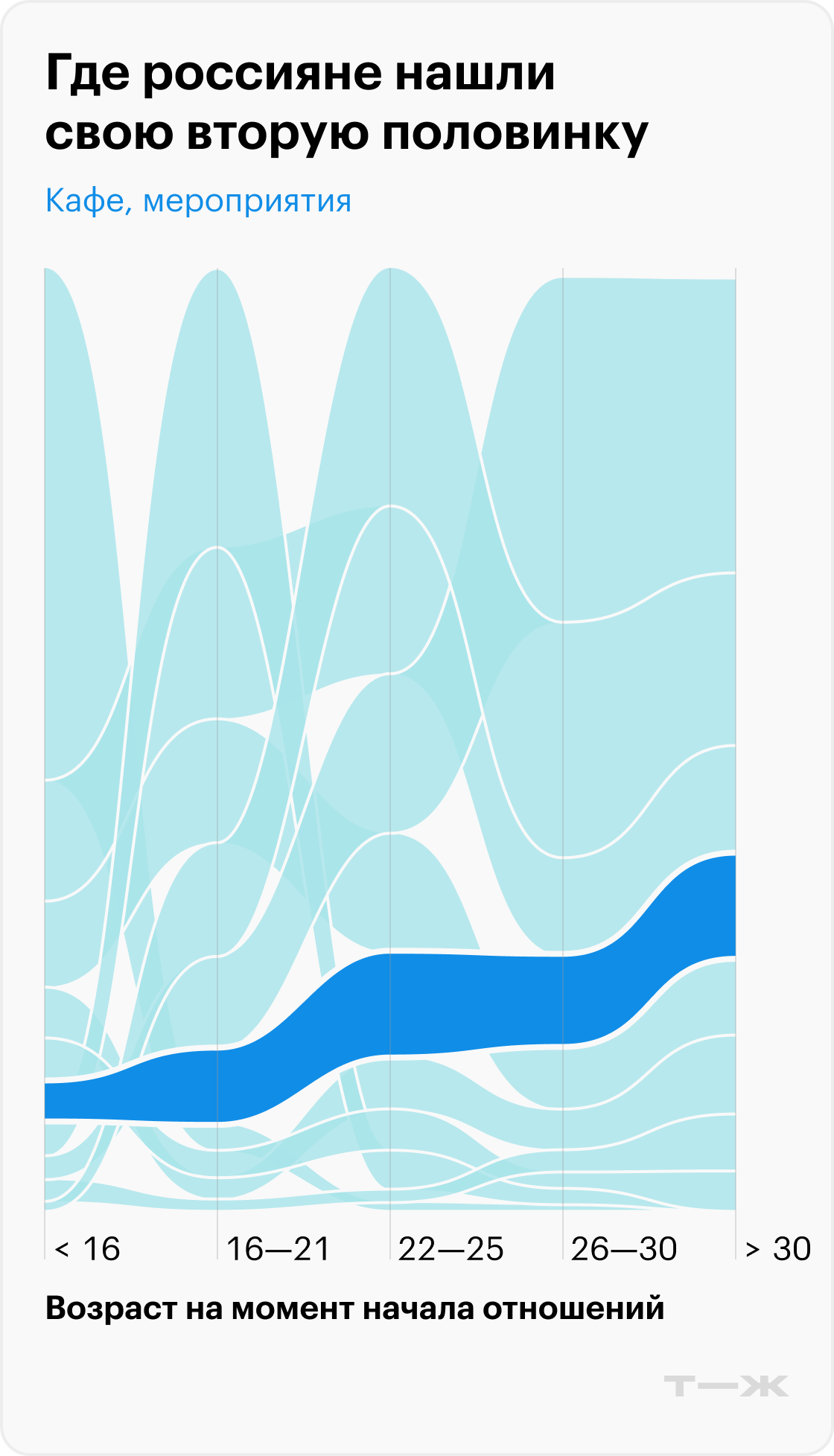 Зато после 25 начинает расти популярность «кафе и мероприятия», «отпуск и отдых», «сообщества по интересам» . То есть чем старше — тем более разнообразными становятся места для знакомства.