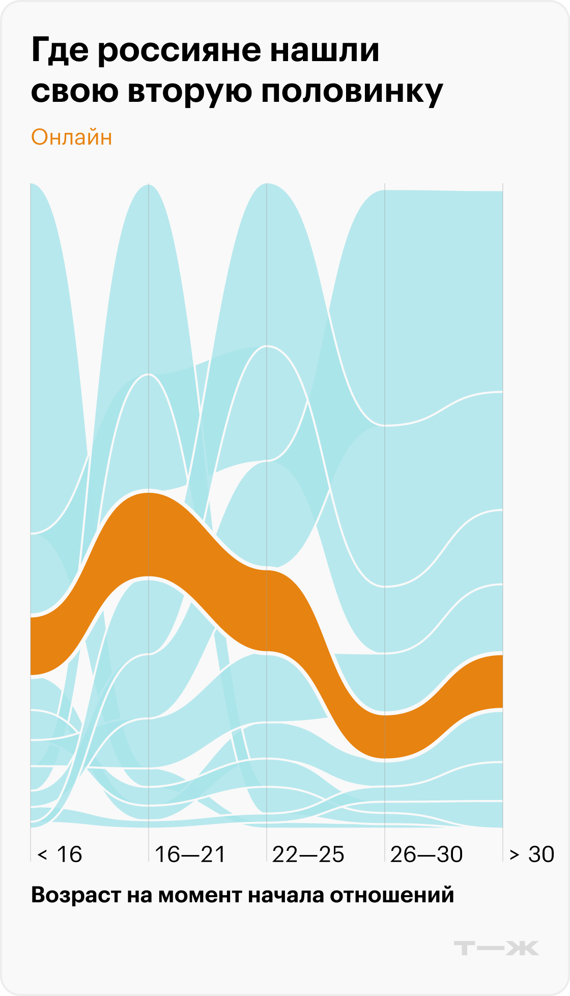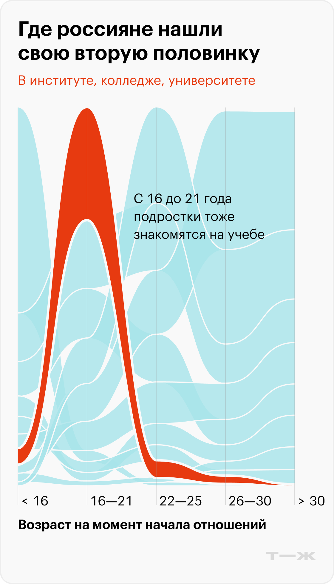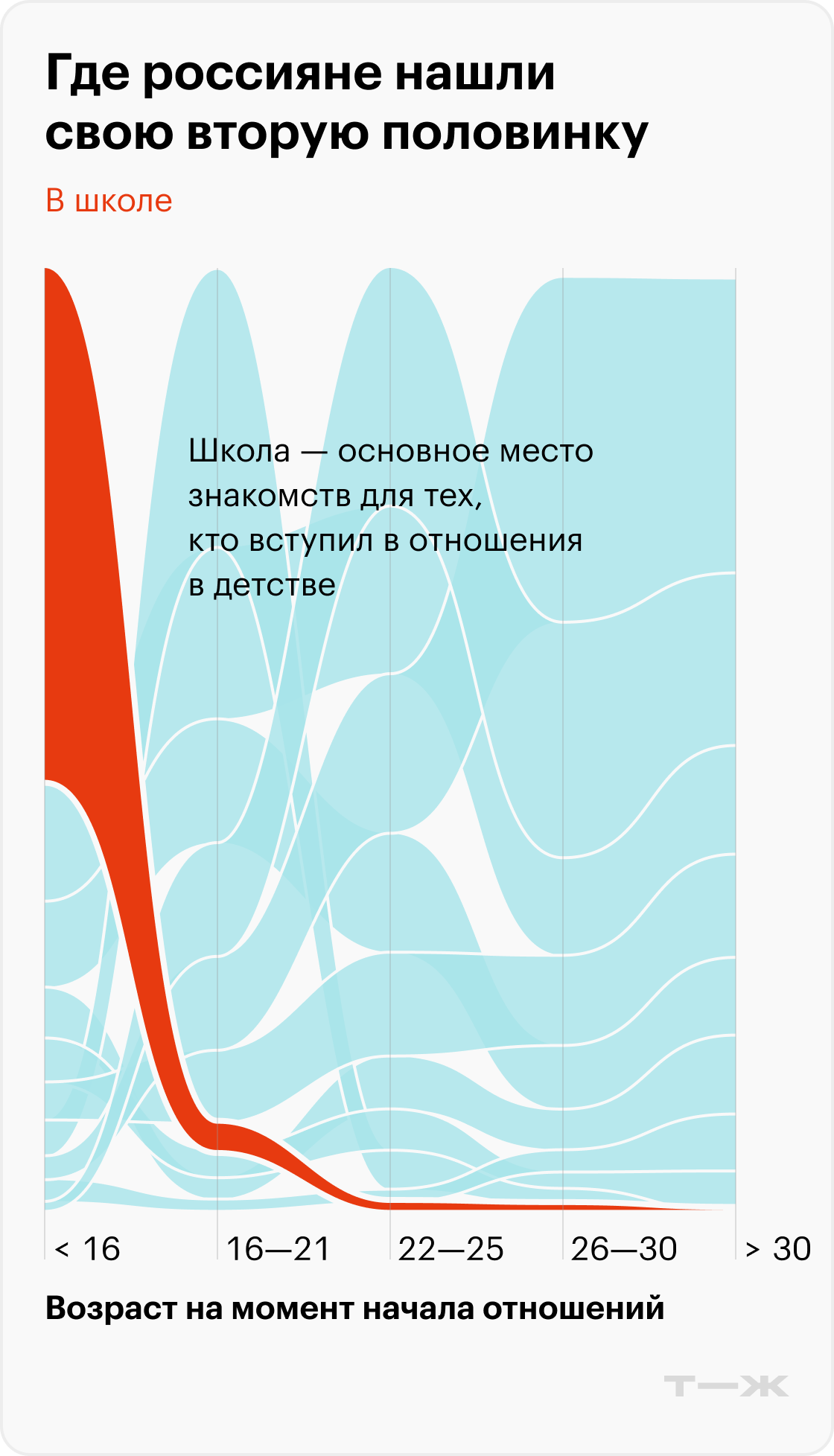 Популярность мест знакомства и возраст взаимосвязаны. Среди тех, кто вступил в отношения до 15 лет включительно, большинство познакомились со своей парой в школе — 55%. С 16 до 21 года чаще всего знакомятся также на учебе — в институте, колледже или университете. В 22—25 — на работе. А с 26 лет уверенное первое место занимают специализированные сервисы для знакомств.