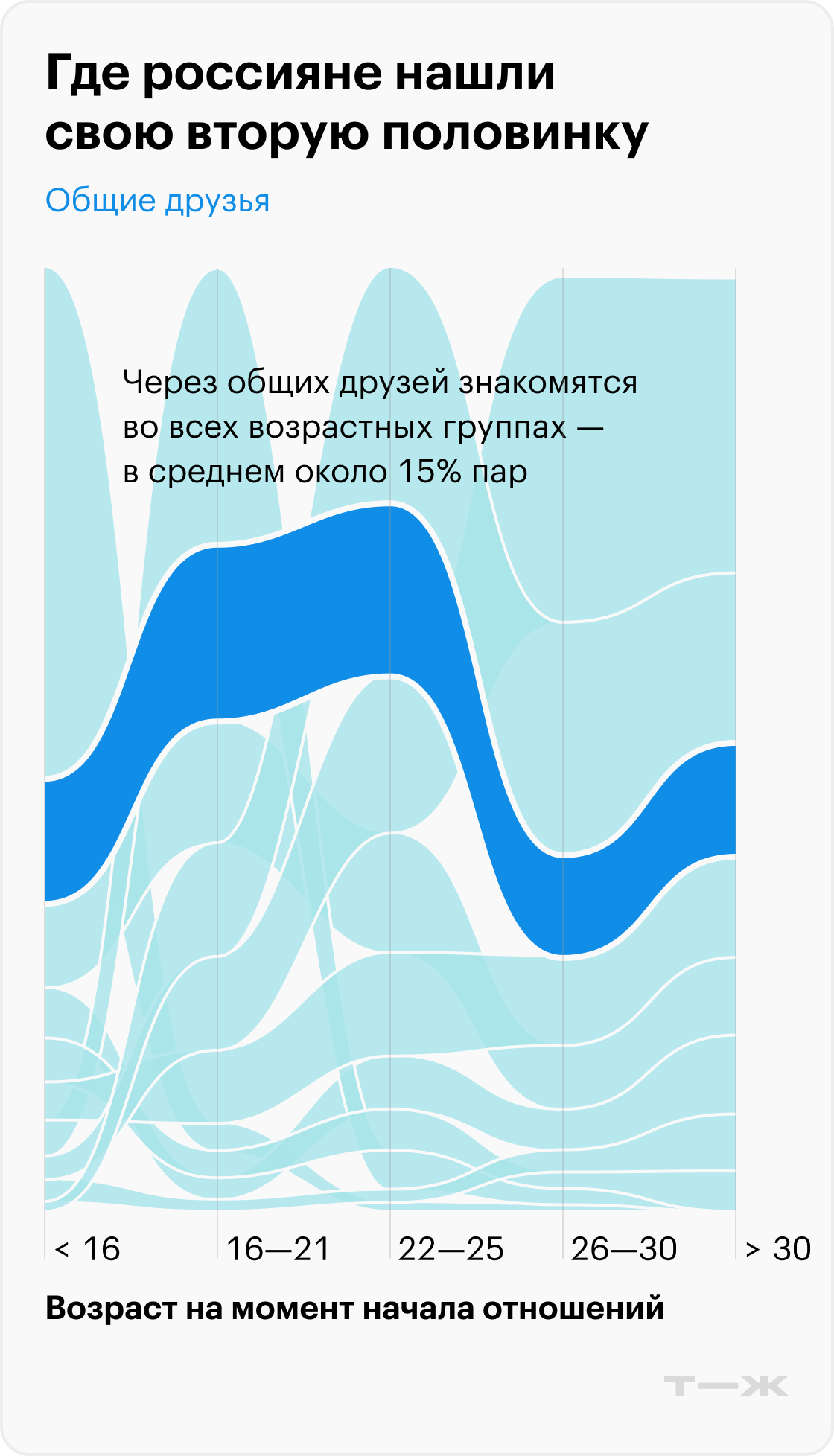 Например, категория «Через общих друзей» занимает стабильное второе-третье место в каждой возрастной группе: в среднем 15% пар по всем возрастным категориям. Категории типа «В школе» и «В вузе» с возрастом снижаются — но все-таки не до нуля.