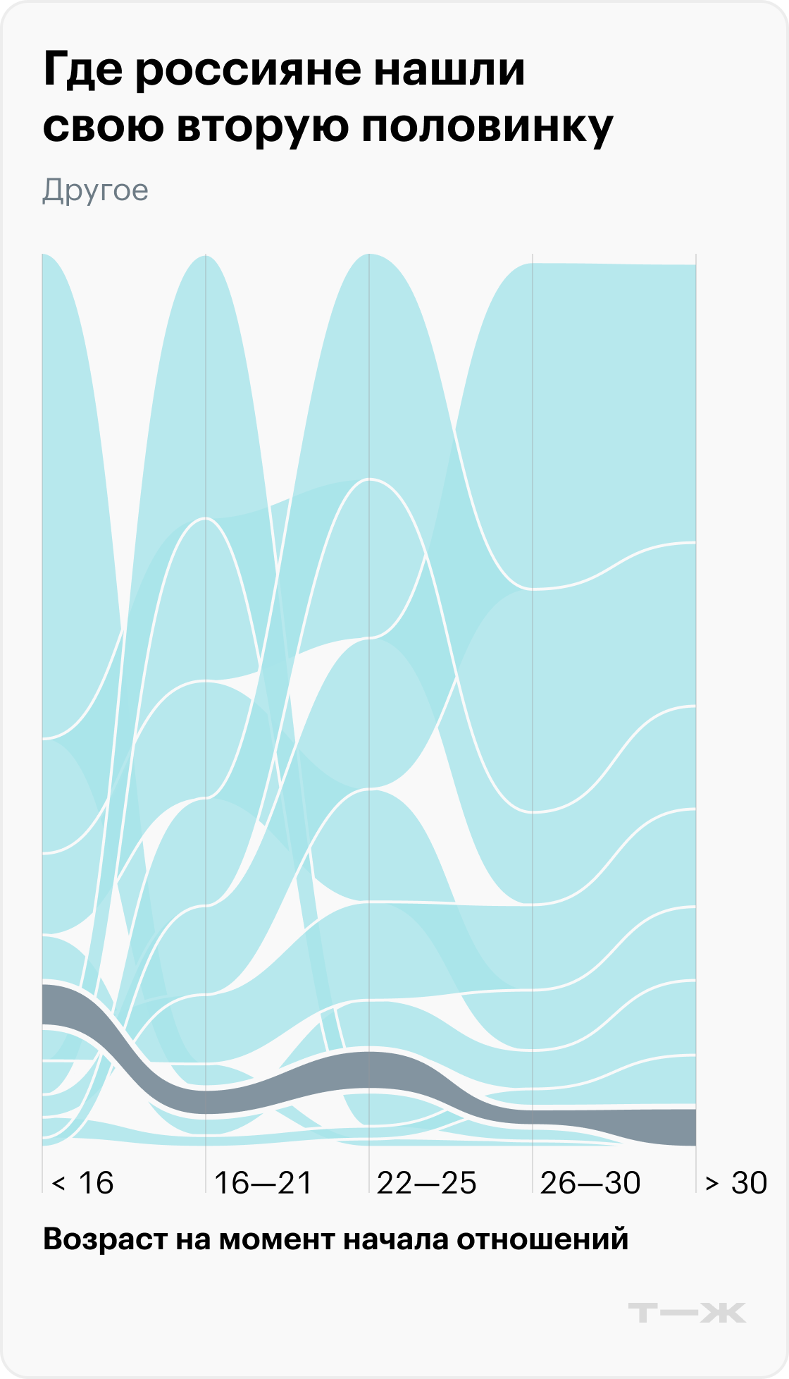 Самые непопулярные ответы из предложенных — знакомства через членов семьи и на специальных офлайн-мероприятиях для знакомств. Впрочем, в юном возрасте семья, а в зрелом — организаторы специальных мероприятий все-таки сыграли свою важную роль для 1—2% пар.