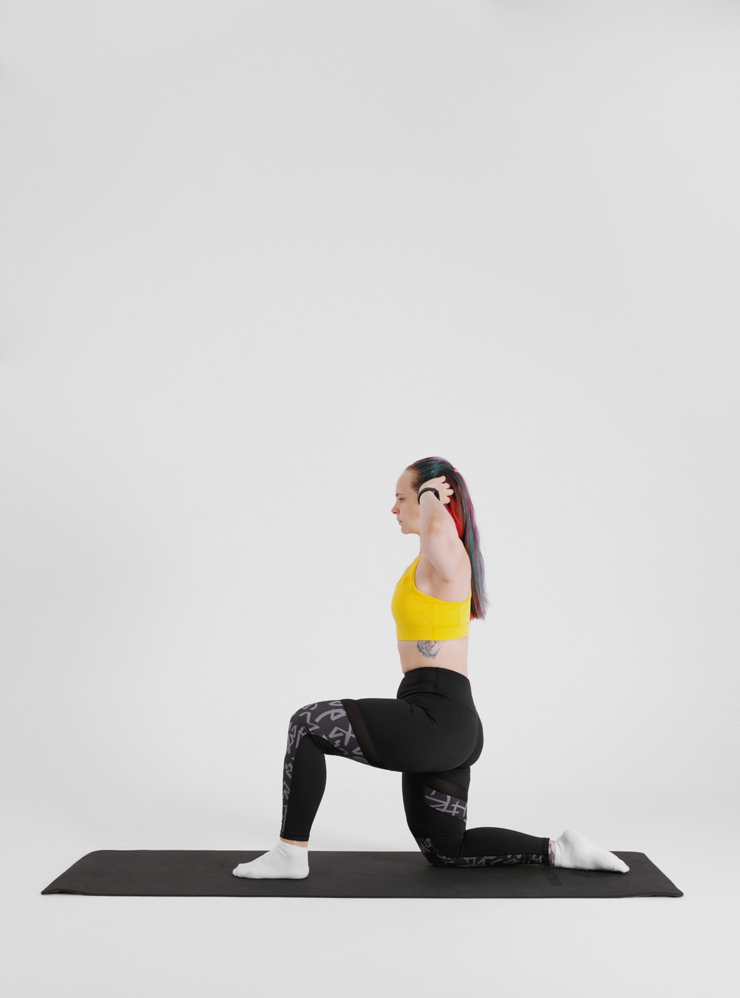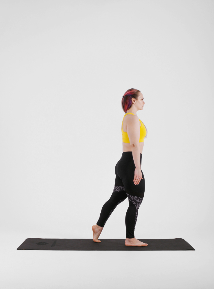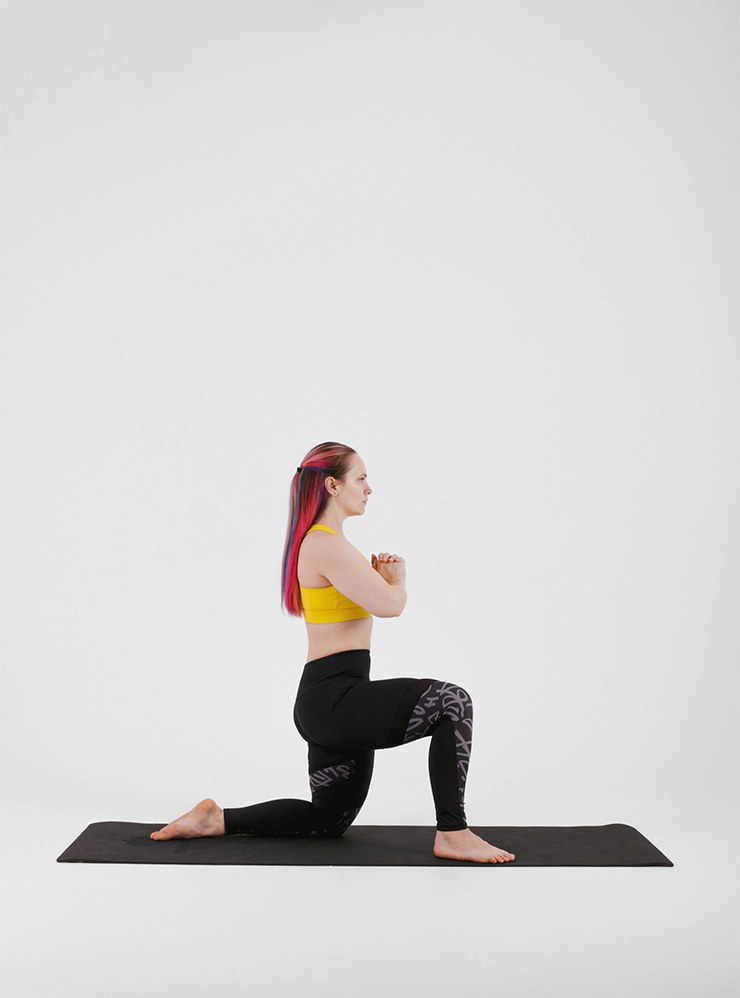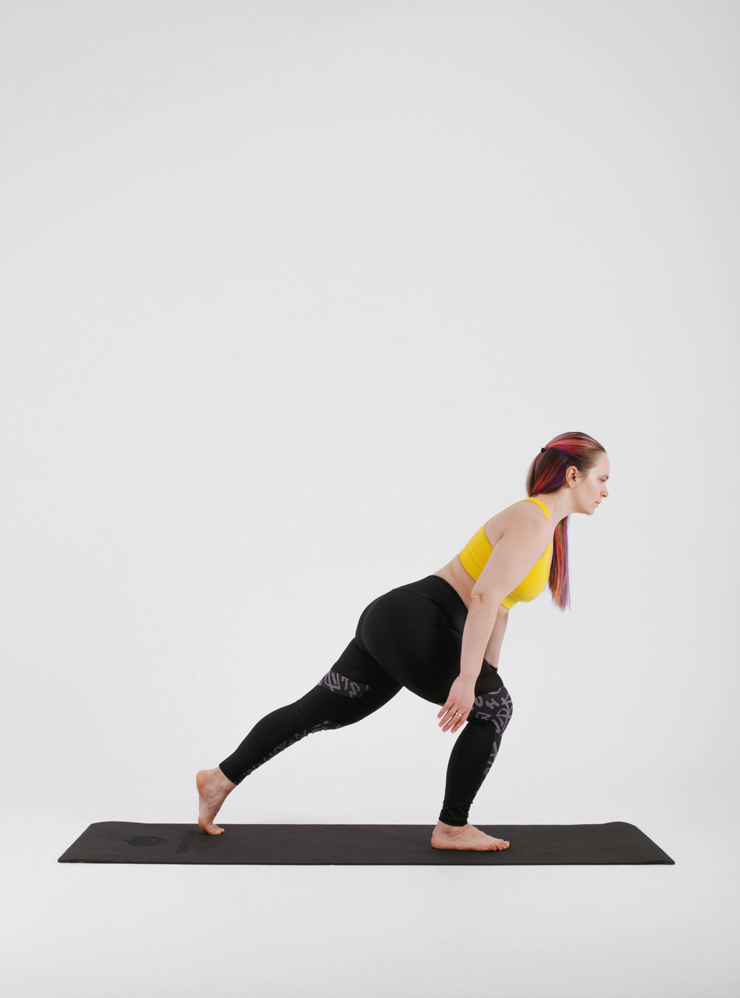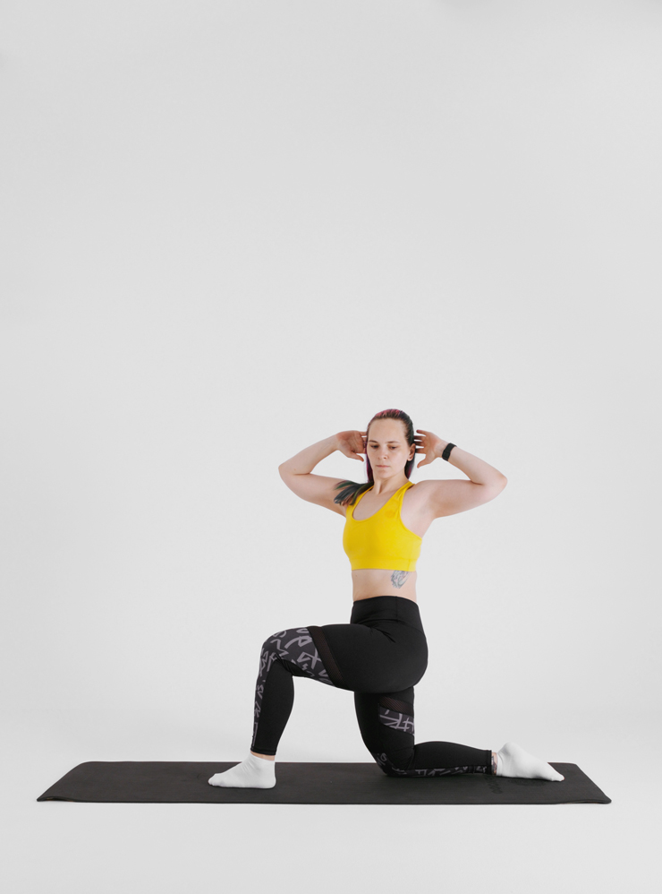 Выпады с дотягиванием ногой и ротацией. Выпады нагружают мышцы ног и ягодиц, а поворот туловища дополнительно задействует мускулы живота. Также статично работают мышцы верхней части спины и плеч.