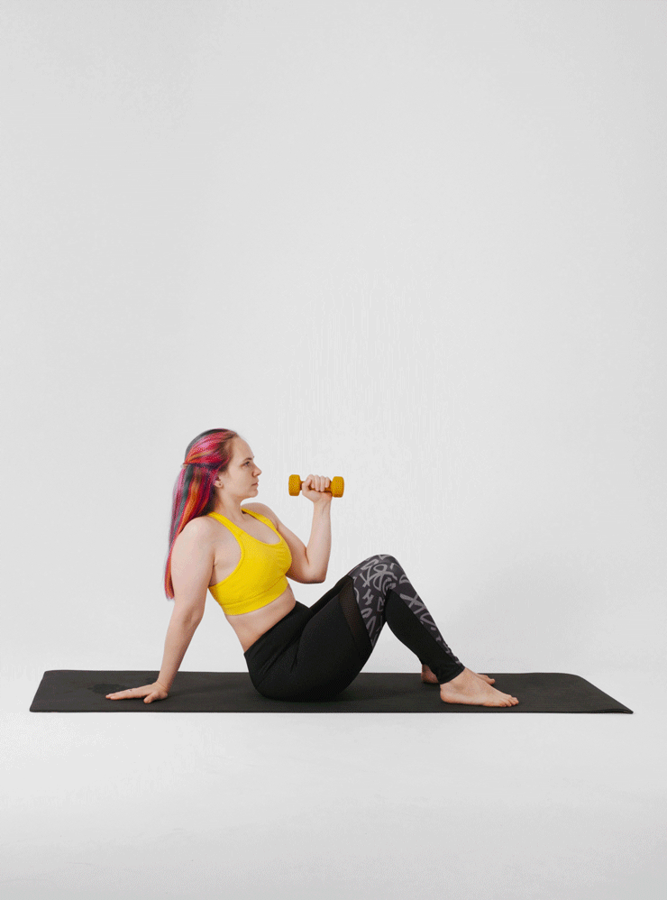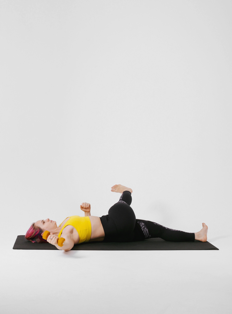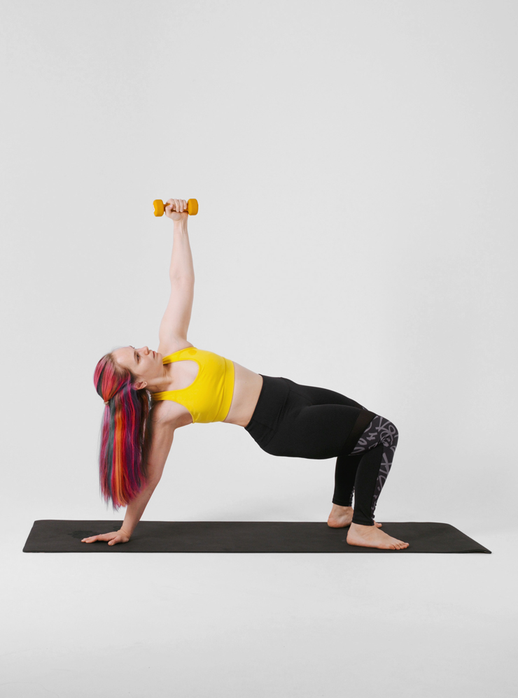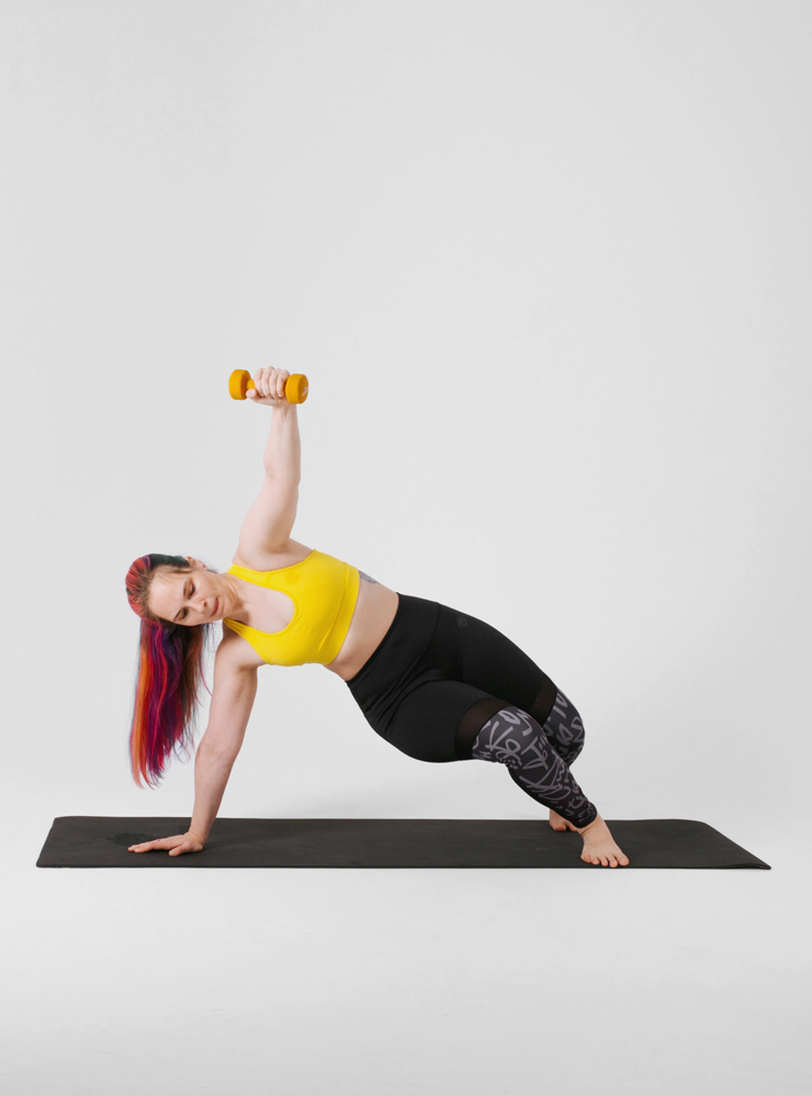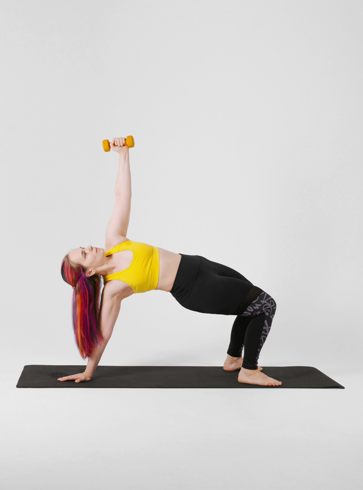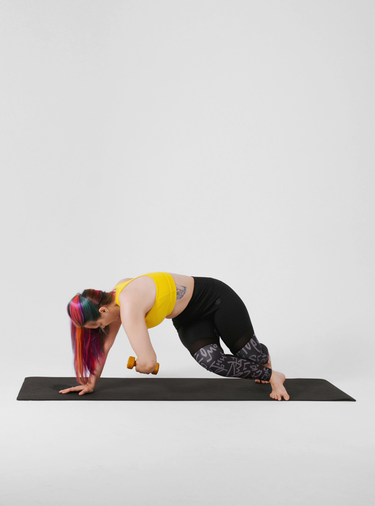 Каждое движение комплексно задействует все тело. Для тренировки понадобятся коврик и гантель 2—5 кг. Заниматься можно босиком и в удобной одежде, которая не сковывает движения.