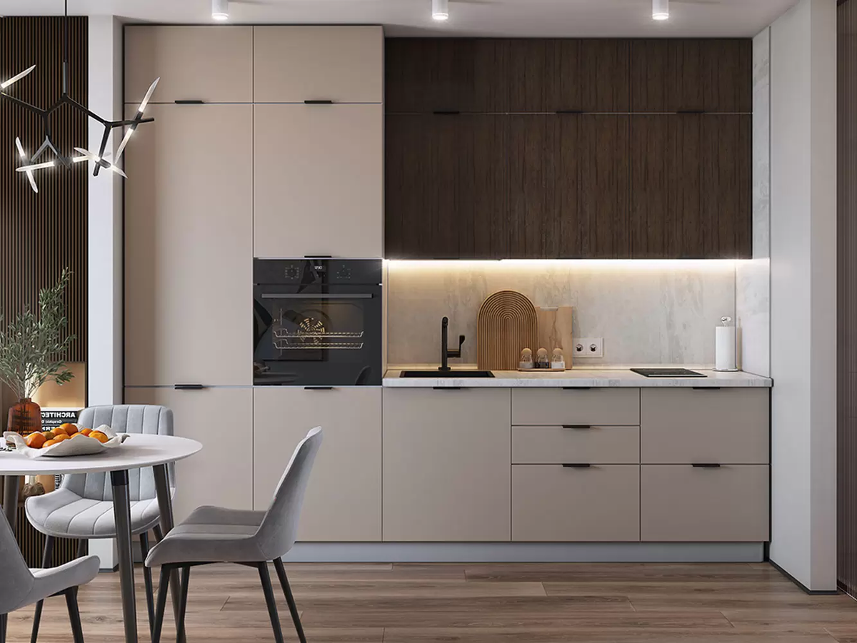 Мое мнение: линейная кухня идеальна для тех, кто не делает из еды культа. Чтобы она была удобной, её длина должна быть не меньше 2.5 метров, иначе места для рабочей поверхности просто не останется.