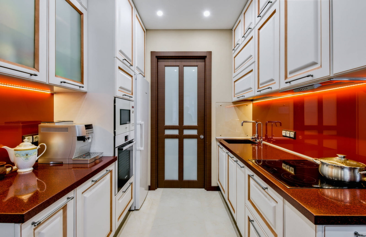 Если у вас вытянутая кухня или помещение с окном напротив двери, две линии мебели — ваше спасение.