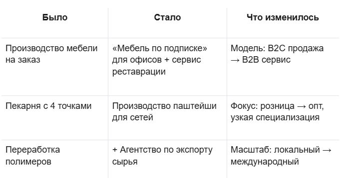 Кейс Богдана: Не стал закрывать производство полимеров, а запустил агентство по закупке/продаже вторичного сырья. Использовал существующие компетенции и связи для нового направления с минимальными вложениями.