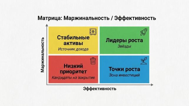 Выпишите все направления бизнеса. Оцените их по матрице: Маржинальность / Перспективность.