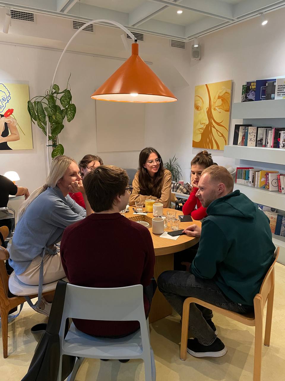 Кофейня “Booker” давно стала узнаваемым местом, и это не просто кофейня. Также это читальный зал, наполненный книгами по искусству, дизайну, кино и архитектуре. Меня многое связывает с этим местом — здесь проводят свои выставки локальные художники, которых часто можно встретить прямо в кофейне, также здесь читают лекции, устраивают кинопоказы, играют в шахматы. Однажды довелось поиграть в теннис. Не удивительно, что здесь появился свой разговорный клуб, который сразу привлёк моё внимание.