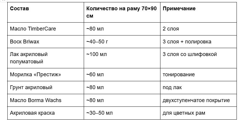 За 4 года через мастерскую прошло больше 200 рам с разными покрытиями. Чёткий вывод один: масло TimberCare — лучший универсальный вариант для 70% случаев. Лак — для ванной и прихожей с детьми. Воск — для антика и рустика.