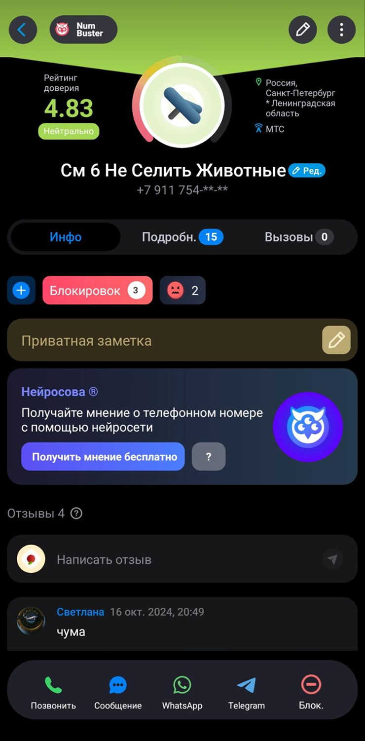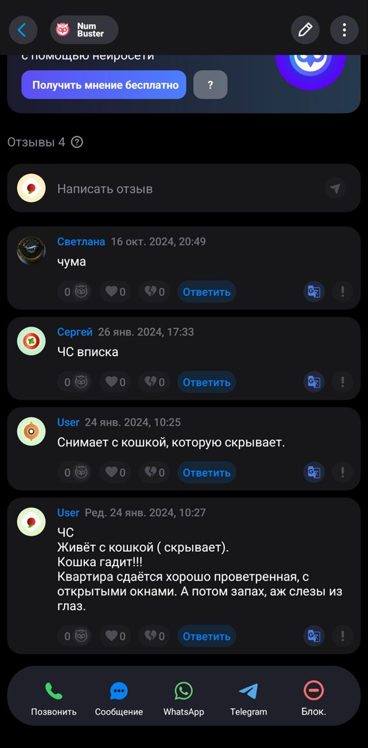 Еще один случай — на скринах ниже. Девушка заселялась в квартиру с животным и умалчивала этот факт. Как итог, кто-то из арендодателей пометил ее контакт — жилье ей будет снять сложнее.