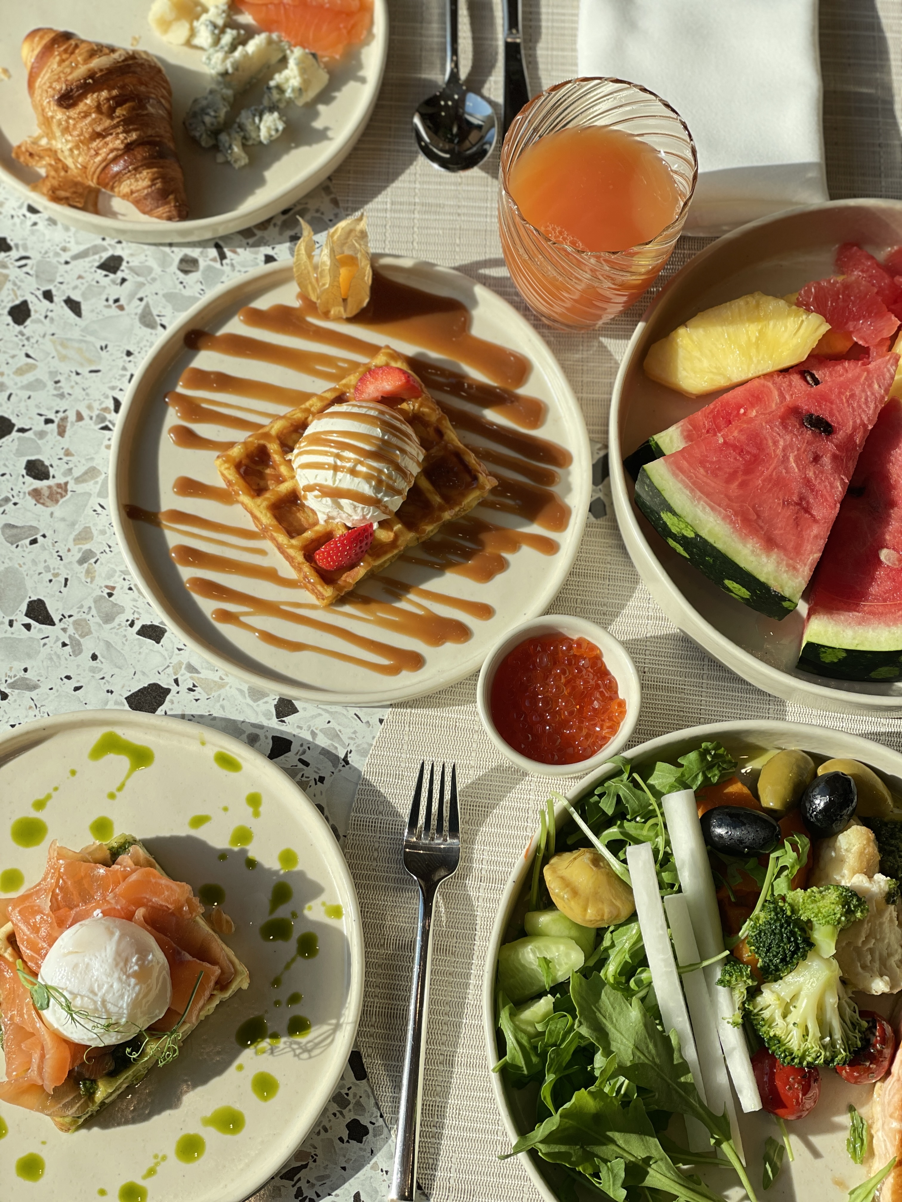 Завтракала я в отеле. И честно говоря, это один из поводов, почему я приезжаю именно сюда) здесь тааааак вкусно. На завтрак можно заказать различные вафли: кабачковую, тыквенную, картофельную с разными наполнителями. Я люблю кабачковую со страчателлой и томатами. Круассаны с красной икрой, свежевыжатый грейпфрутовый сок, благородные сыры, голубику размером с черешню. И обязательно айс-латте на кокосовом молоке с собой)
