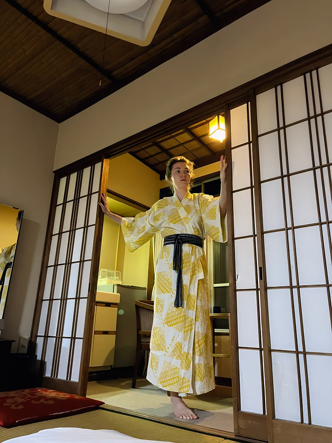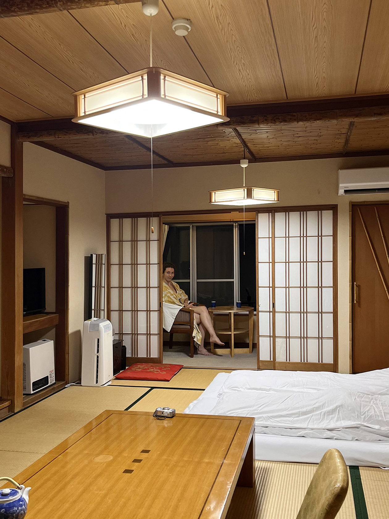 Вечером мы прибыли в отель. На английском говорил только администратор, остальной персонал — нет. Нам предложили тапочки и проводили в номер. Двери раздвижные, из бамбука, на полу — татами из соломы. Из мебели — небольшой шкаф и столик в центре комнаты, из техники — увлажнитель воздуха и кондиционер. Японцы не признают систему отопления, поэтому греются кондеями.