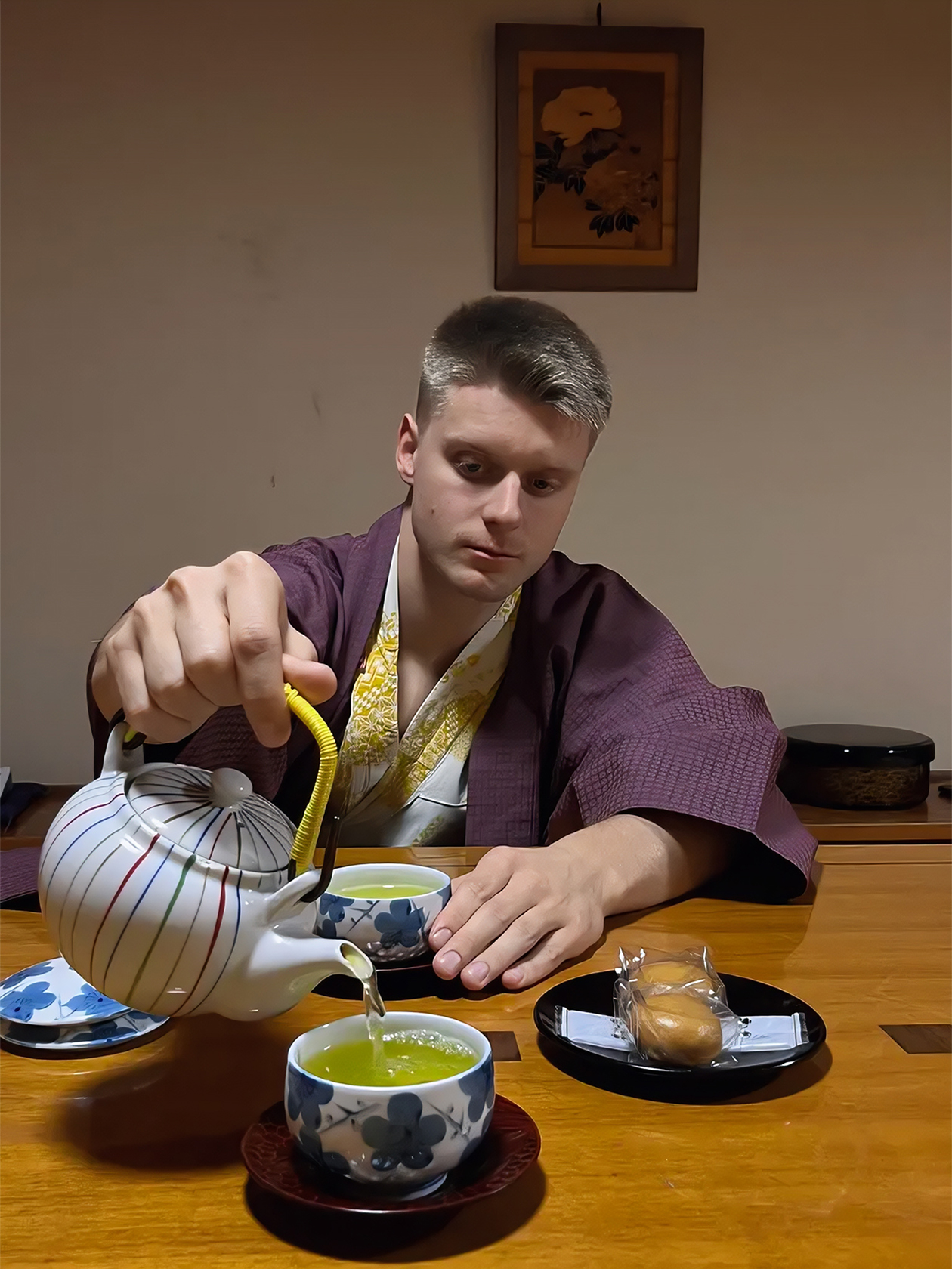 В шкафу нас ждали юкаты — специальная одежда для рекана. Выпив чаю, мы переоделись и пошли в онсен.