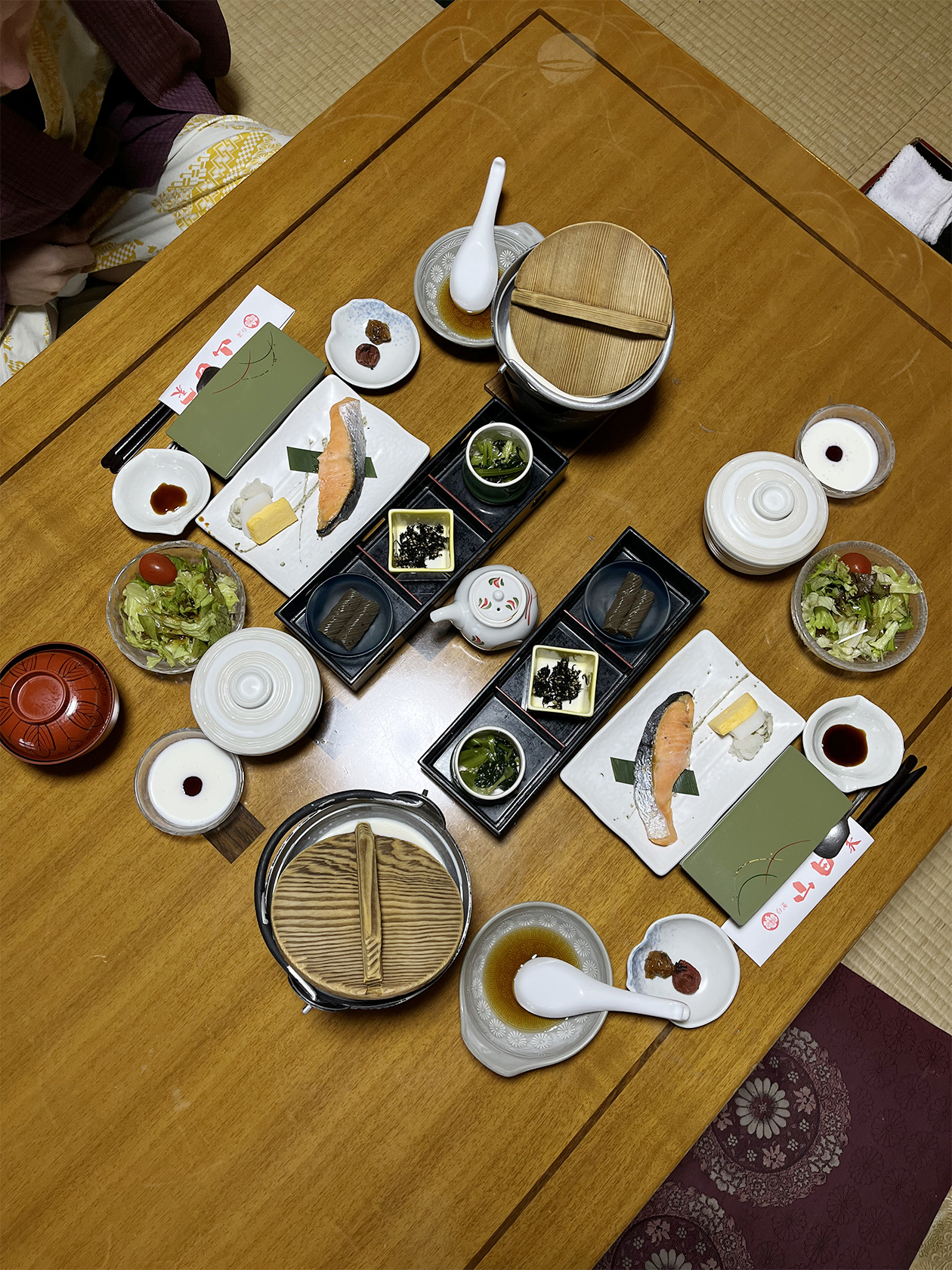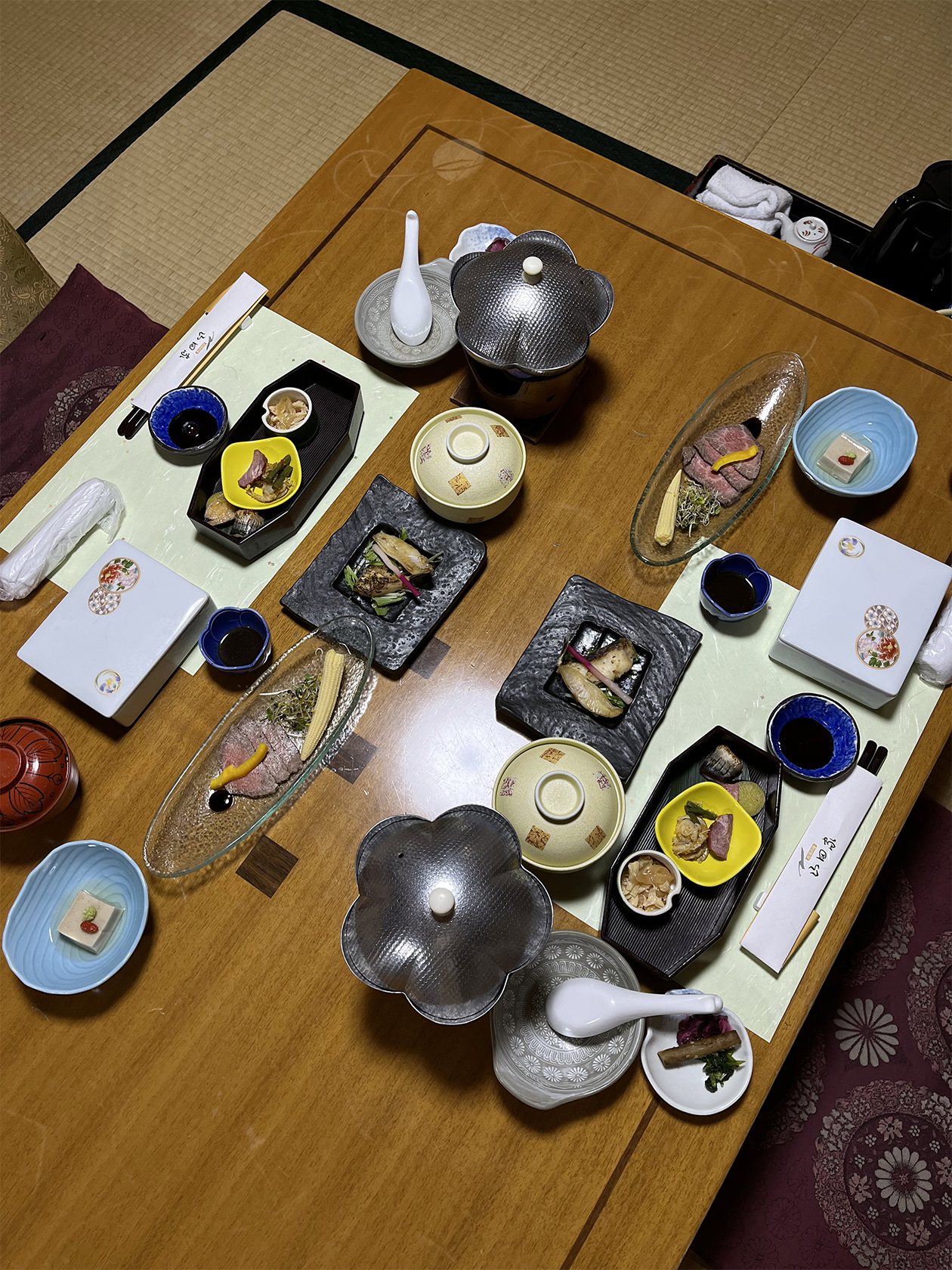 Прием пищи состоял из восьми-десяти позиций и включал закуски, основное блюдо, суп, десерт. Завтрак отличался от ужина по наполнению: больше легких блюд на пару, меньше мяса. Еда очень специфическая, но в основном вкусная. Говядина вагю, рыба, мисо-суп и припущенные овощи были ой как хороши. А вот пресный водянистый пудинг мы не поняли.