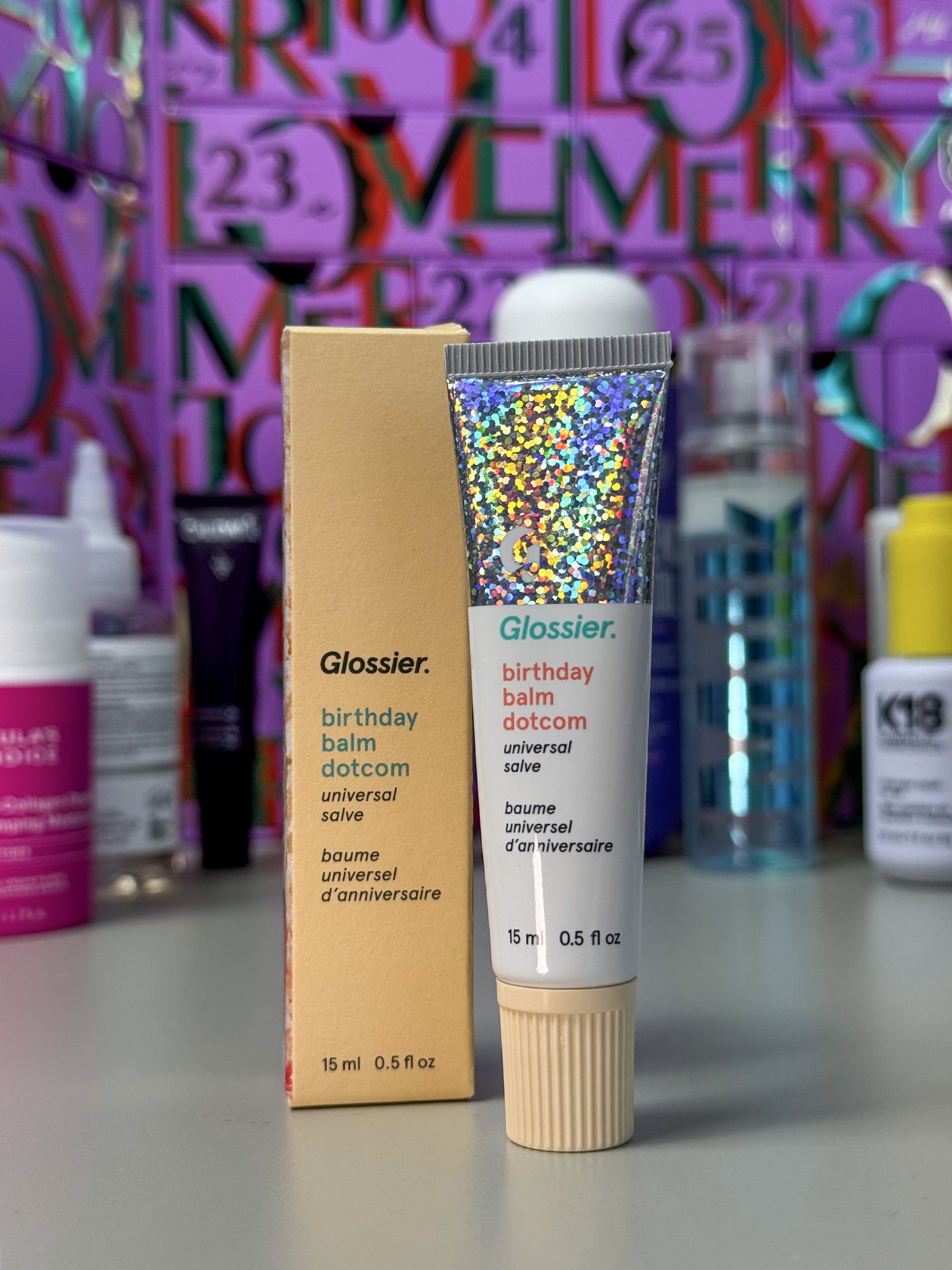 Бальзам для губ Glossier — Birthday Balm Dotcom Lip Balm. Бальзам с ужасным приторно-химозным запахом и крупными блестками, неприятно наносить на губы.