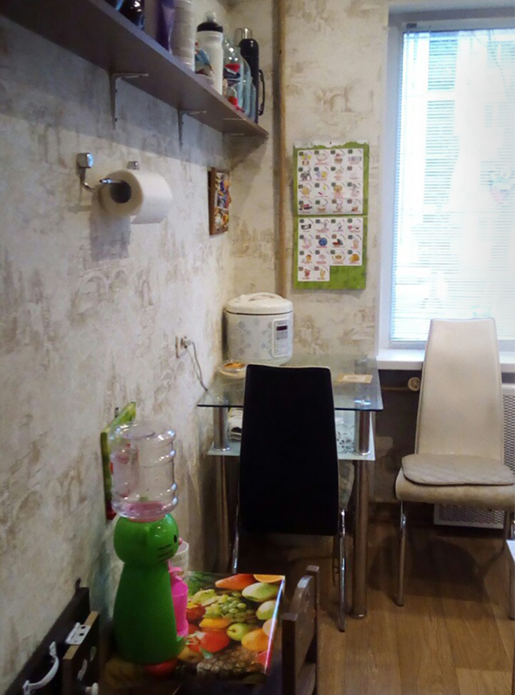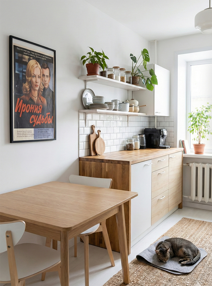 В качестве исходного фото возьмем реальное изображение весьма захламленной кухни с детскими принадлежностями и введем такой запрос к нейросети: «Улучши фото этой кухни, чтобы его можно было выставить в объявлении о продаже. Убери детские вещи и полку. Добавь резкость и убери шум».
