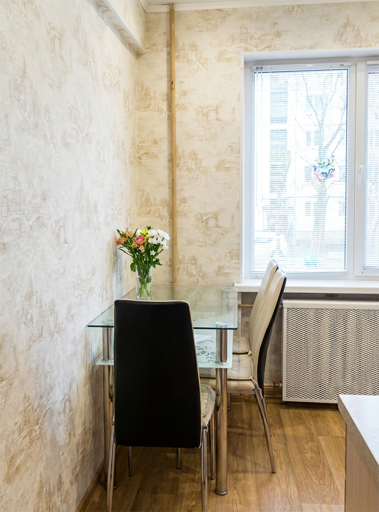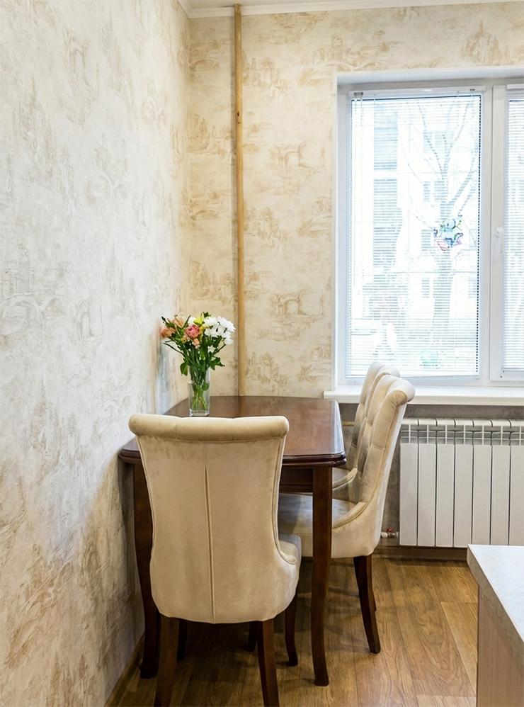 Продолжим эксперименты с нашей кухней и очистим ее от невыгодных деталей: торчащей балки на стене слева и старого радиатора, прикрытого решеткой. Балку уберем вовсе, а радиатор заменим на современный. Добавим премиальности интерьеру: «Выровняй стену слева (убери балку сверху), замени стулья и стол на более дорогие. Поменяй батарею на биметаллическую».