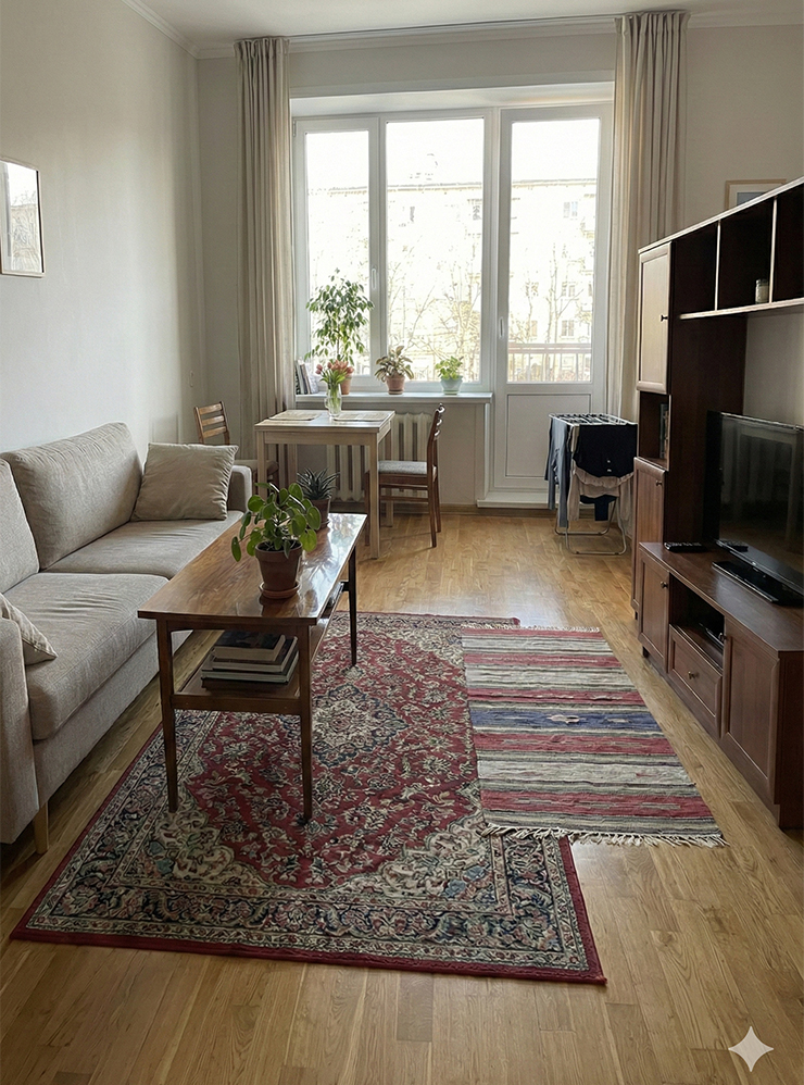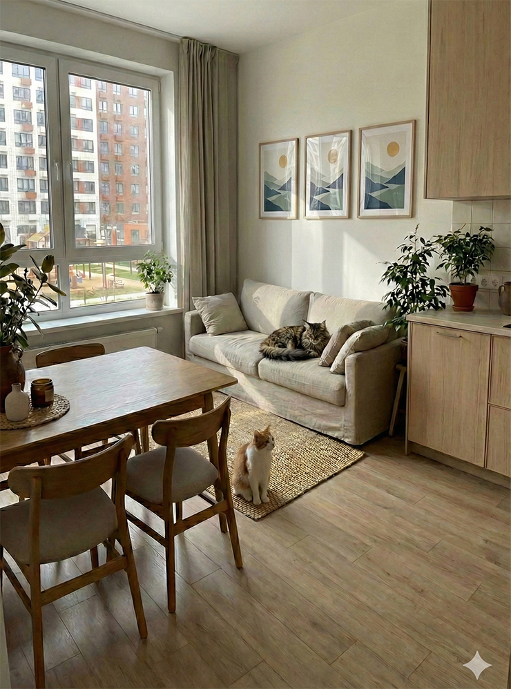 - Неконсистентность. Обычно при сдаче делают много фотографий квартиры. И нейросети могут сделать несколько ИИ-снимков одного и того же пространства. Но чем больше картинок, тем больше шанс, что детали на них будут различаться: то подушка поменяет цвет, то кресло переедет.