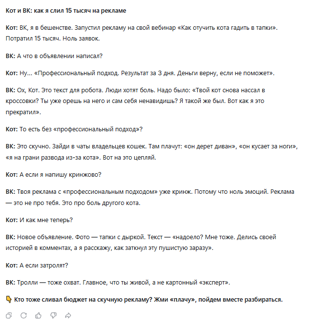 Во втором заходе я попросила написать текст с другими персонажами: ВК (как соцсеть) и Кот. Обозначила проблему про слив бюджета при рекламе. Ответы нейросети на фото.