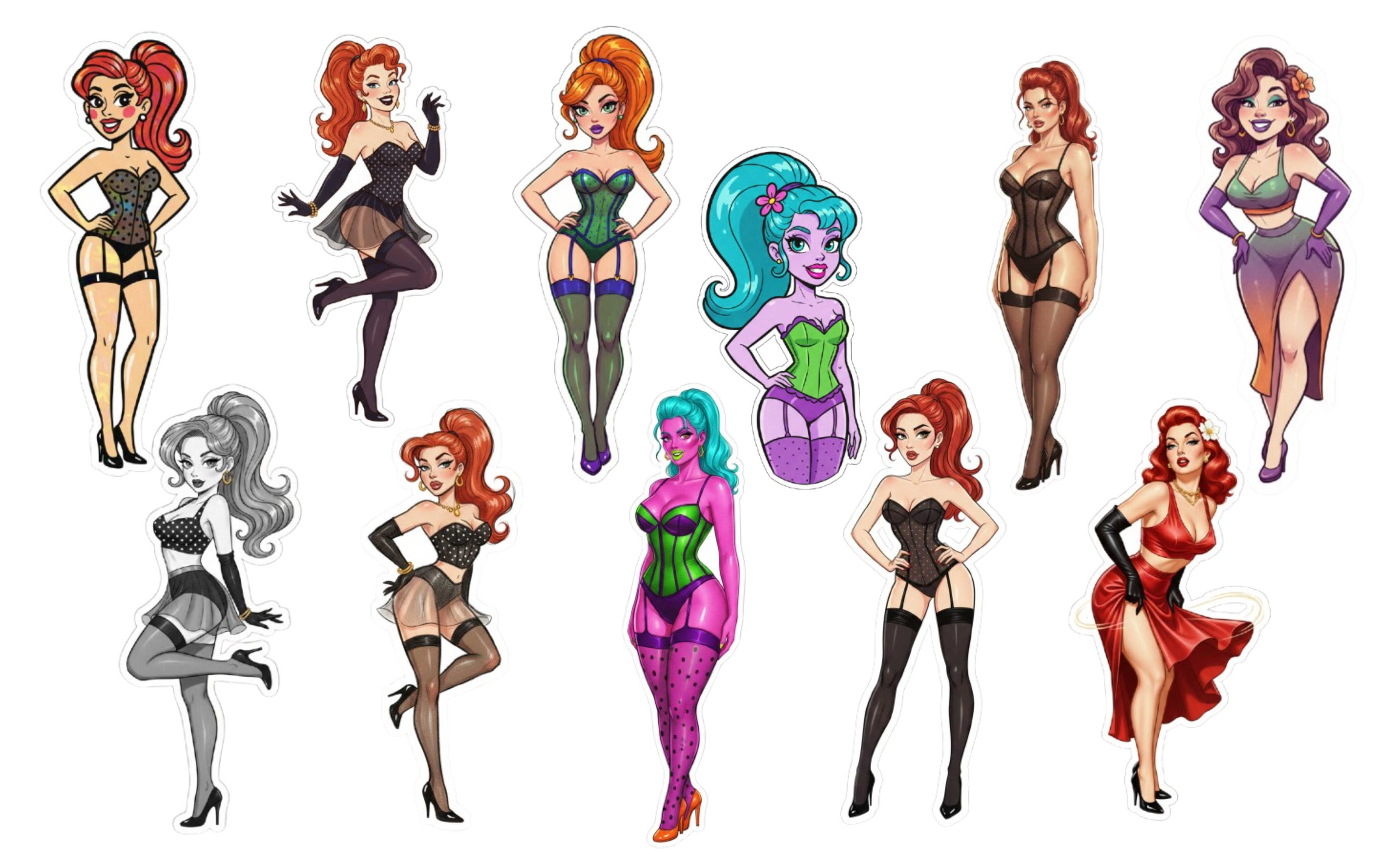 A vintage-inspired illustration of a glamorous redhead pin-up girl in a playful dynamic stance in a warm pastel studio backdrop, capturing classic 1950s pin-up aesthetics with modern sophistication, voluminous red hair styled in a high ponytail, exaggerated glossy lips, subtly enhanced cheekbones and jawline, flawless porcelain skin, dramatic winged eyeliner and long lashes, wearing a polka dot crop top with a high-waisted sheer mini skirt, black thigh-high stockings, stiletto heels, elegant long black gloves and luminous golden accessories catching the light, confident and flirtatious mood, cinematic vintage poster atmosphere with clean line art and soft film grain texture, warm studio lighting with gentle highlights and shadows, shot with a virtual medium format camera, 85mm lens look with shallow depth of field aesthetic, warm pastel color palette with rich reds, soft creams and golden accents, Sticker, Content, Dark, Pixar, Contour, Vector, White Background, Detailed