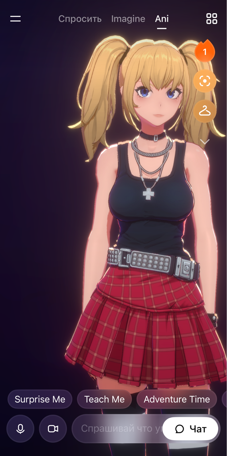 - Ани — самый известный персонаж Grok. Аниме-блондинка с голубыми глазами, которая постоянно заигрывает с пользователями-мужчинами.