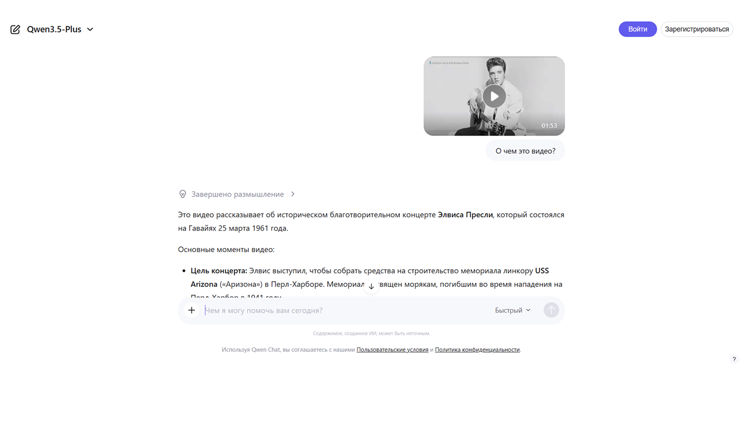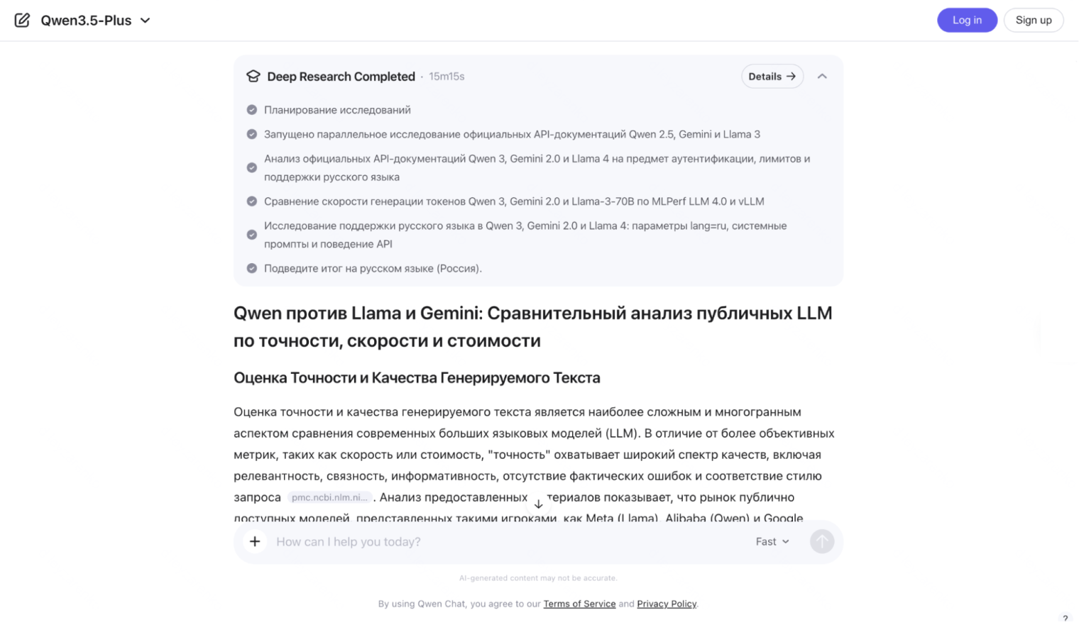 Qwen — нейросеть китайской компании Alibaba, владельца Aliexpress. В теории здесь почти все функции можно попробовать без регистрации — выбирать разные режимы работы и модели, генерировать картинки, искать в интернете, загружать в чат файлы, изображения, видео, аудио. Доступно даже глубокое исследование. Без регистрации нельзя только создавать видео и презентации, а также работать в проектах.