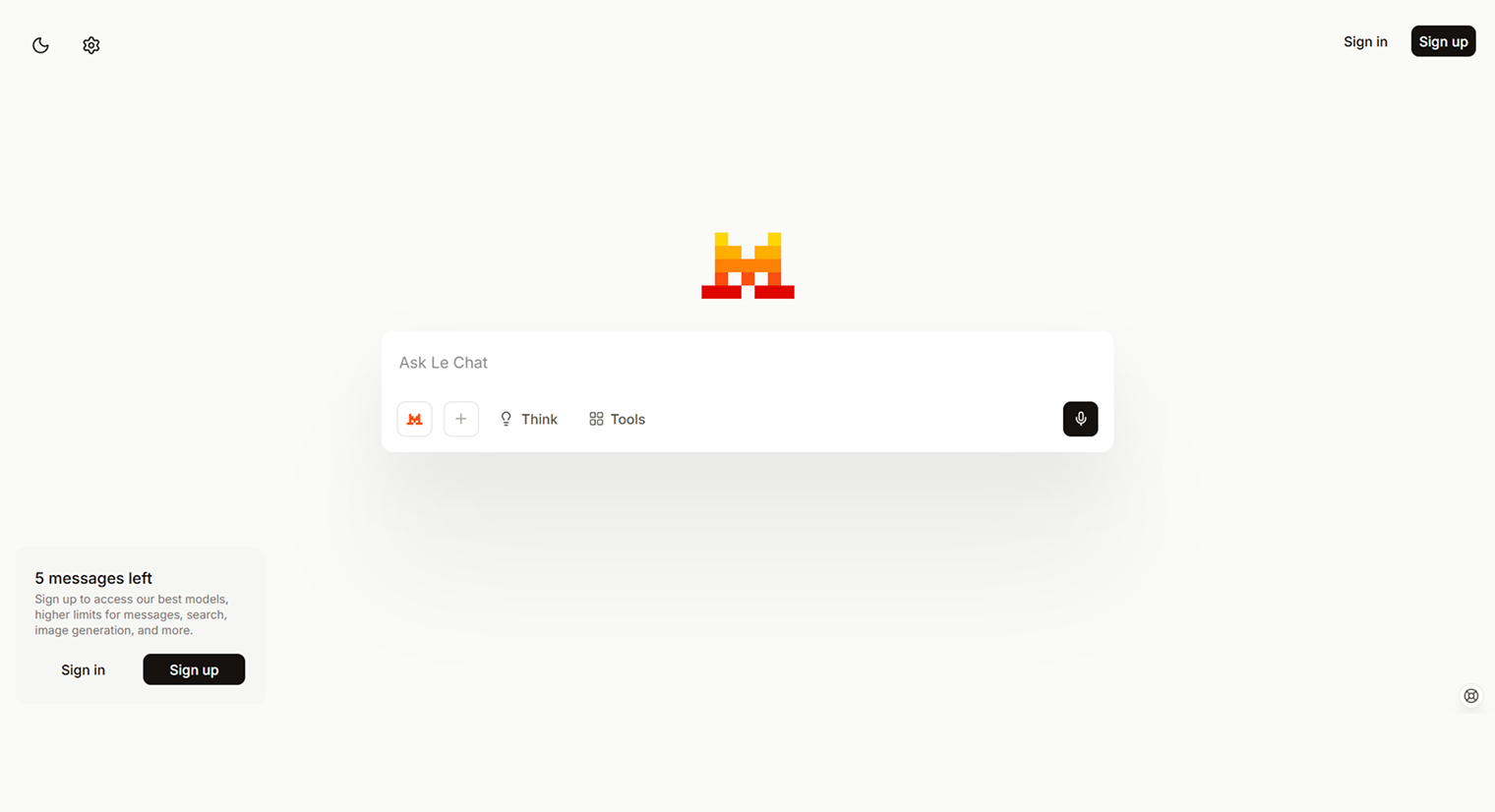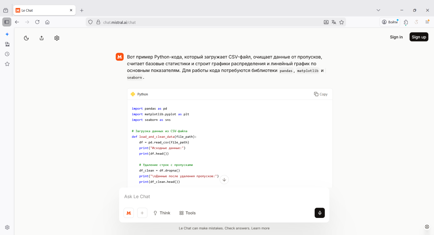 Mistral AI — французский стартап, который разрабатывает бесплатного чат-бота Le Chat. В гостевом режиме доступны текстовые запросы, генерация картинок, поиск в интернете, режим холста и интерпретатор кода.