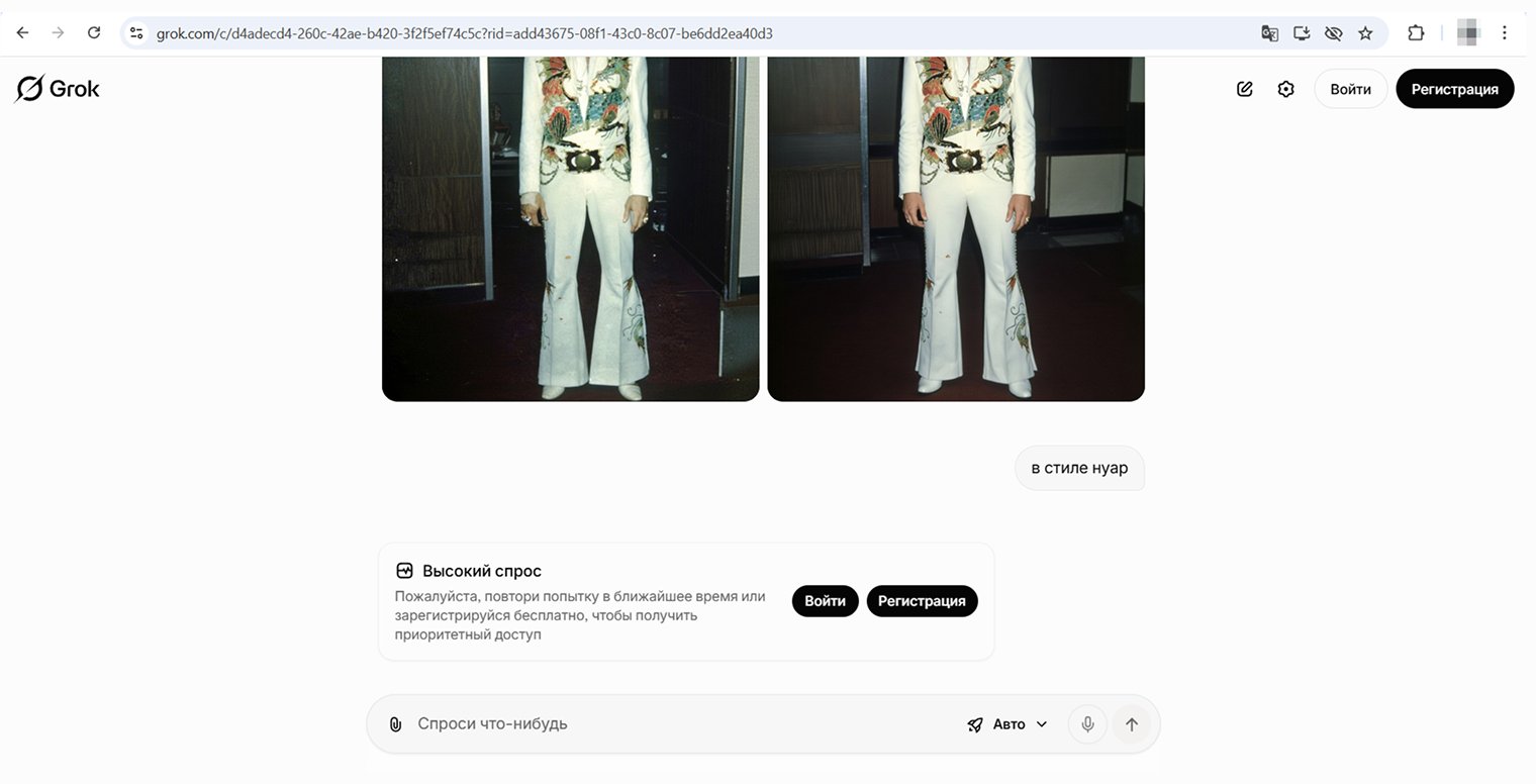 Без аккаунта лимиты исчерпываются довольно быстро. В одной сессии это произошло после трех вопросов, в другой — после одной генерации картинки и загрузки двух документов, в третьей — после редактирования трех картинок. По достижении лимита приходит уведомление о высоком спросе и необходимости зарегистрироваться. Помогает обновление страницы, но тогда диалог сбрасывается.