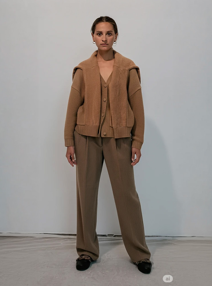 Сначала я загрузила фото модели в джемпере, которая стоит не анфас, а чуть боком. Это могло помешать нейросети распознать фасон, но результат отличный: детали проработаны, вещи выглядят правдоподобно, искажений нет.