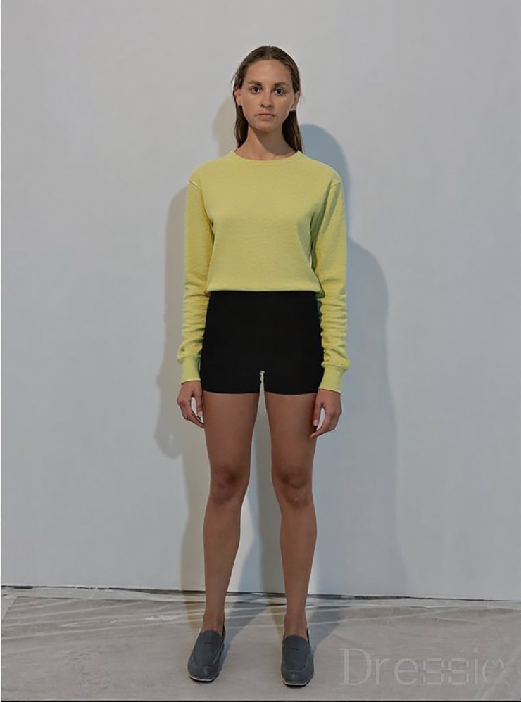 Я протестировала сервис на джемпере и юбке, снятых в плоской раскладке. Фактура ткани и крой передались достоверно. Ноги, которых не было видно на исходном фото из-за джинсов, дорисовались достаточно реалистично. Плюс сервис добавил несколько вариантов обуви и вариант без нее.