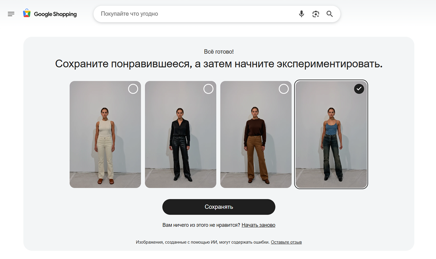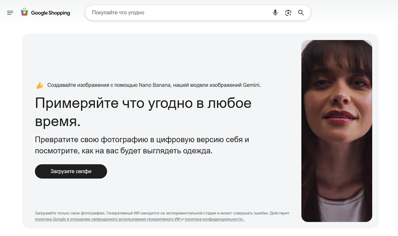 Google Shopping — сервис для покупок от Google, использующий нейросеть Nano Banana для генерации картинок. В нем можно примерить одежду с западных маркетплейсов и сразу ее купить. Правда, из России это сделать не получится.