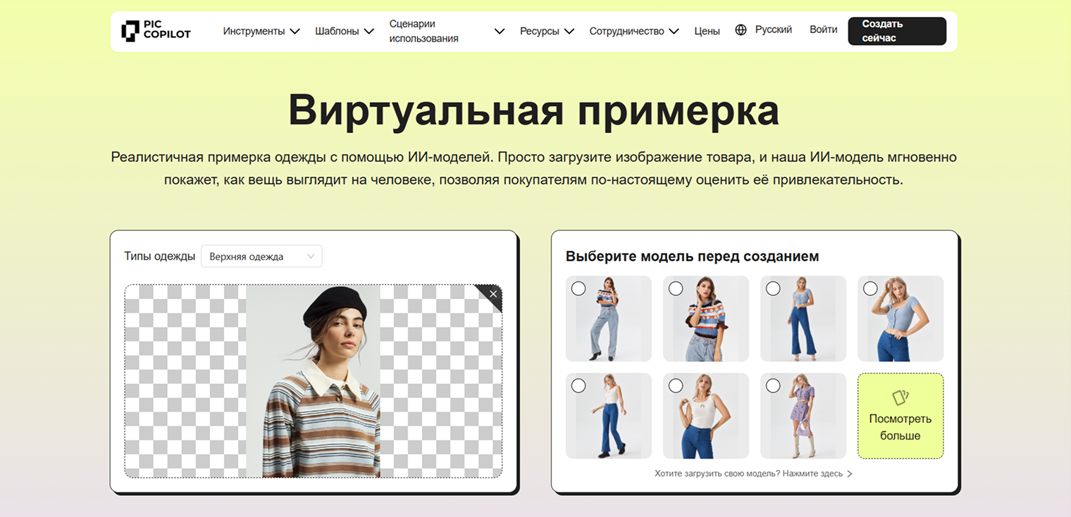 PicCopilot — ИИ-платформа для генерации и редактирования изображений для маркетплейсов. Виртуальная примерка — один из ее инструментов.