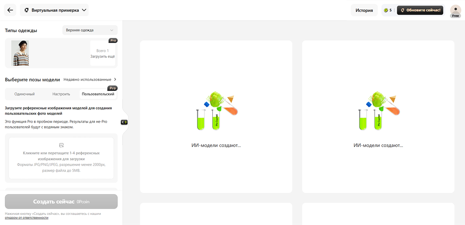 В качестве референса модели можно загрузить от одного до четырех фото. Но чем больше снимков, тем дороже: генерация по одному фото стоит пять монет, по четырем — 20. Так что лучше загружать одно, чтобы сэкономить попытки. Тогда монет хватит на пять примерок.