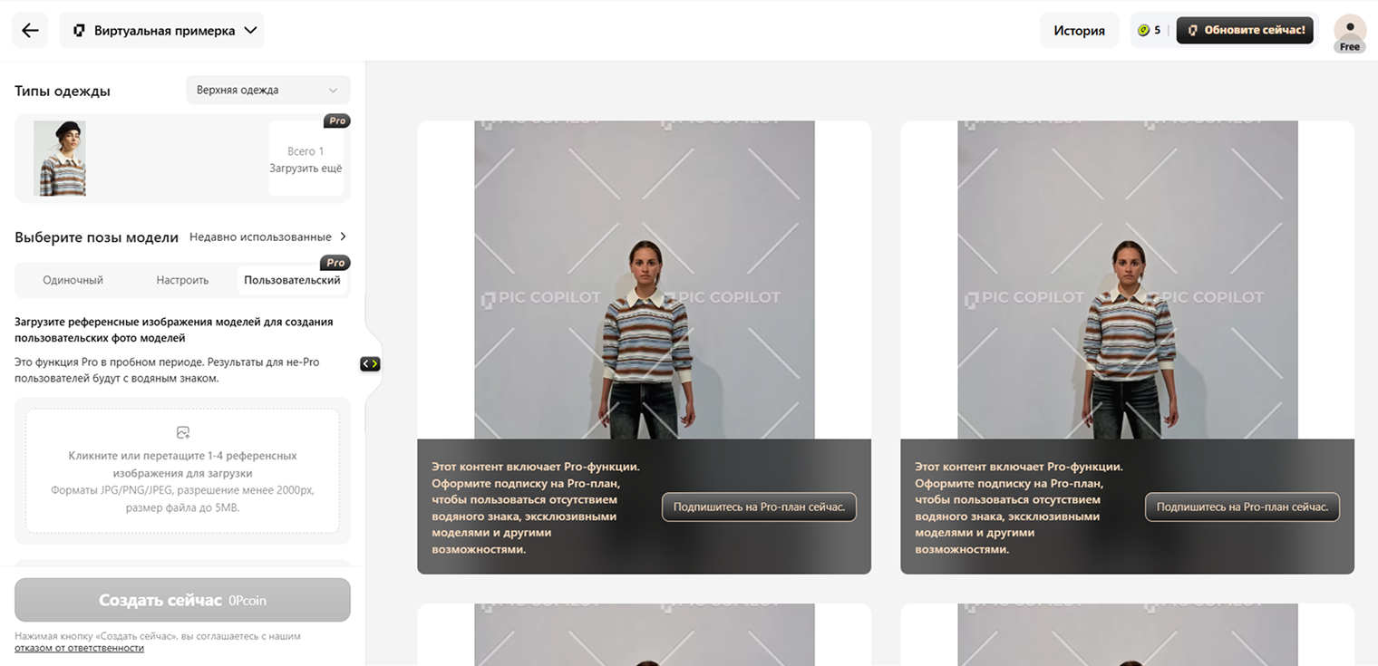 Важный нюанс: примерка одежды на свое фото — это функция из платной подписки Pro, доступная во время пробного периода. Поэтому результаты выдаются с водяным знаком на всю картинку.