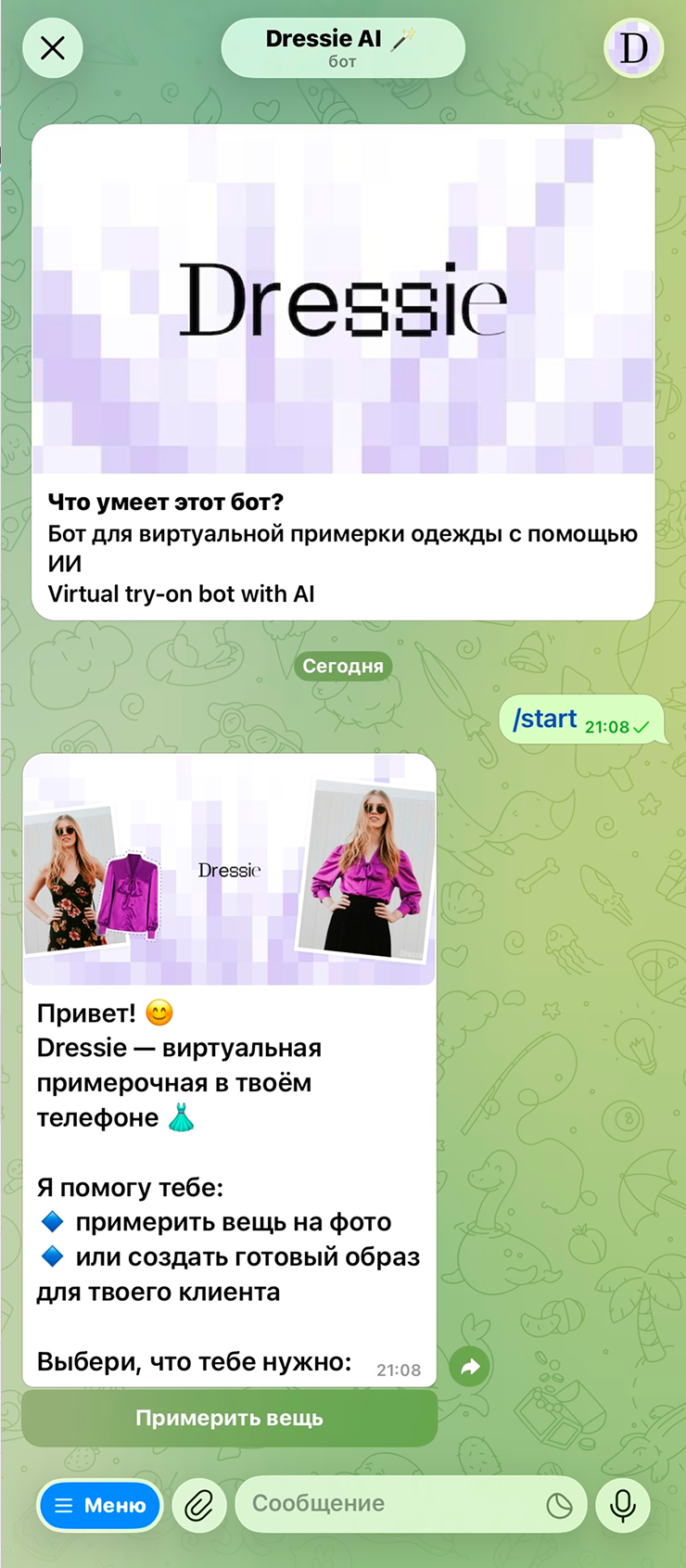 Бесплатно бот дает десять кредитов, которых хватит на десять примерок. Запустите его и загрузите свое фото в полный рост. Затем отправьте изображение вещи и выберите в открывшемся меню, что именно будете примерять: обувь, верх, низ, полный образ, плащ. Одежду лучше загружать не на модели, а разложенную на белом фоне. А обувь — наоборот, надетую.