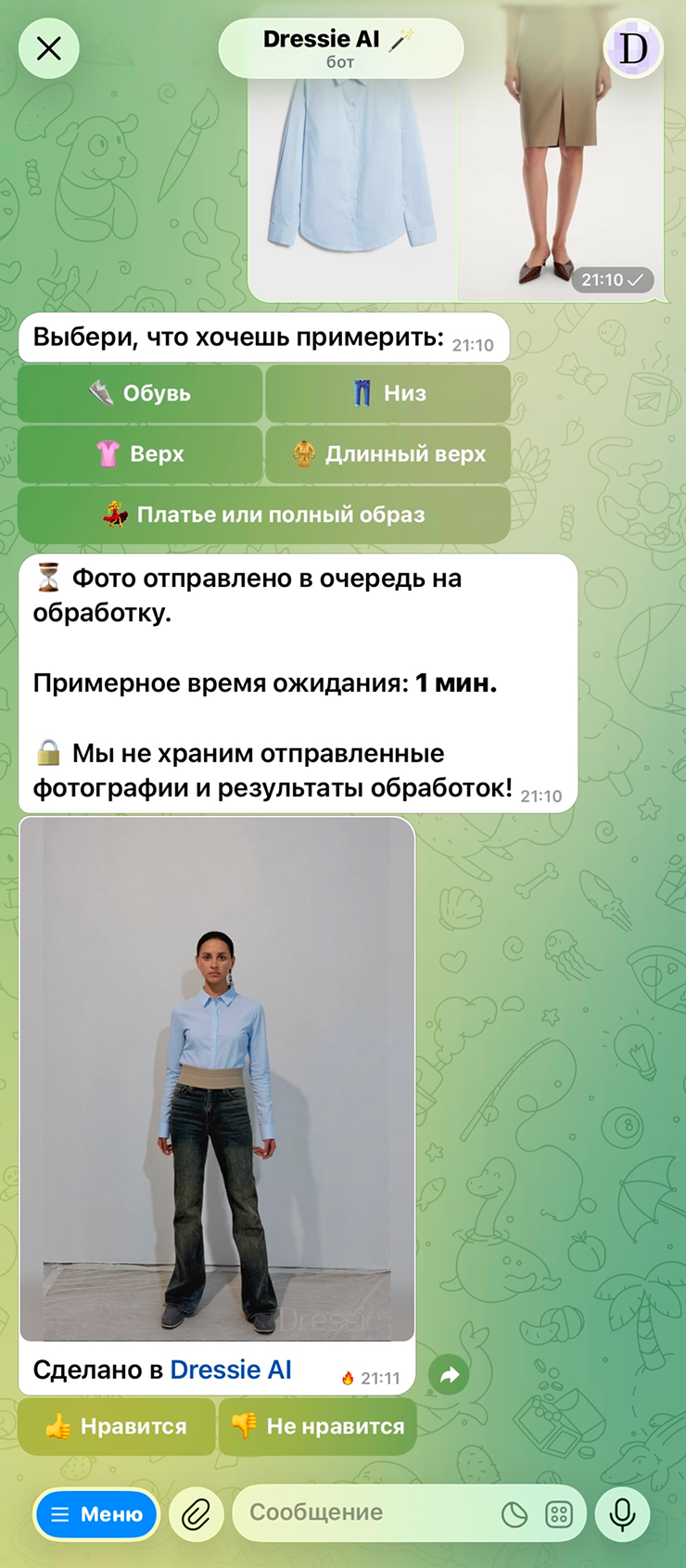Бот не позволяет примерить несколько вещей одновременно. Зато остальной образ сервис не трогает — все, кроме замененной вещи, остается как на исходном фото. Сама генерация занимает пару минут.