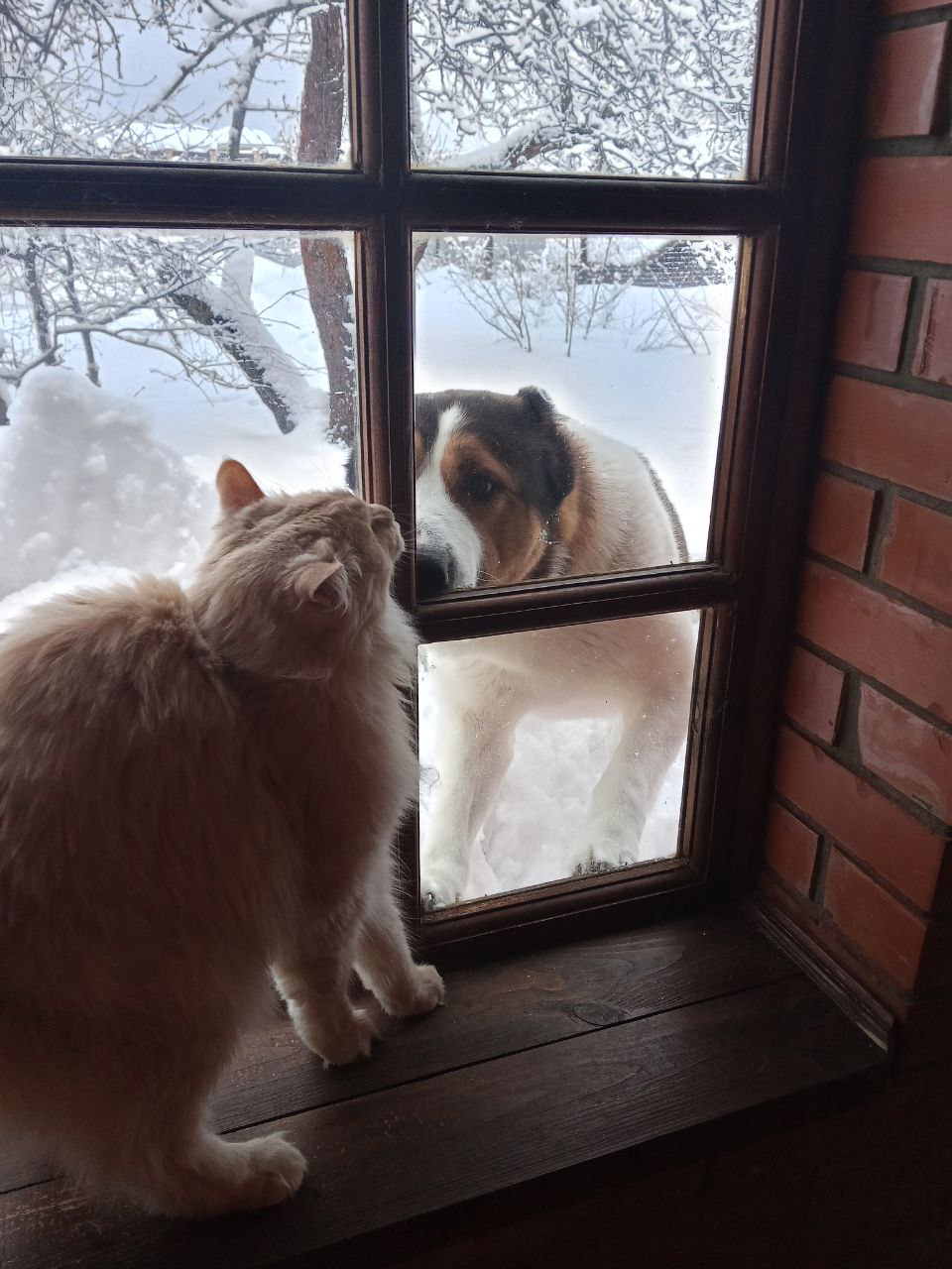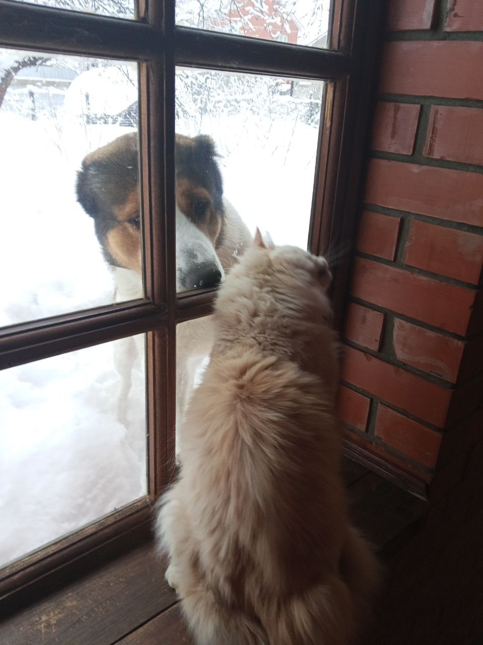 Забар с нетерпением ждёт, когда же братики выйдут погулять на веранду. И вот долгожданная встреча. Пожелали друг другу доброго утра!