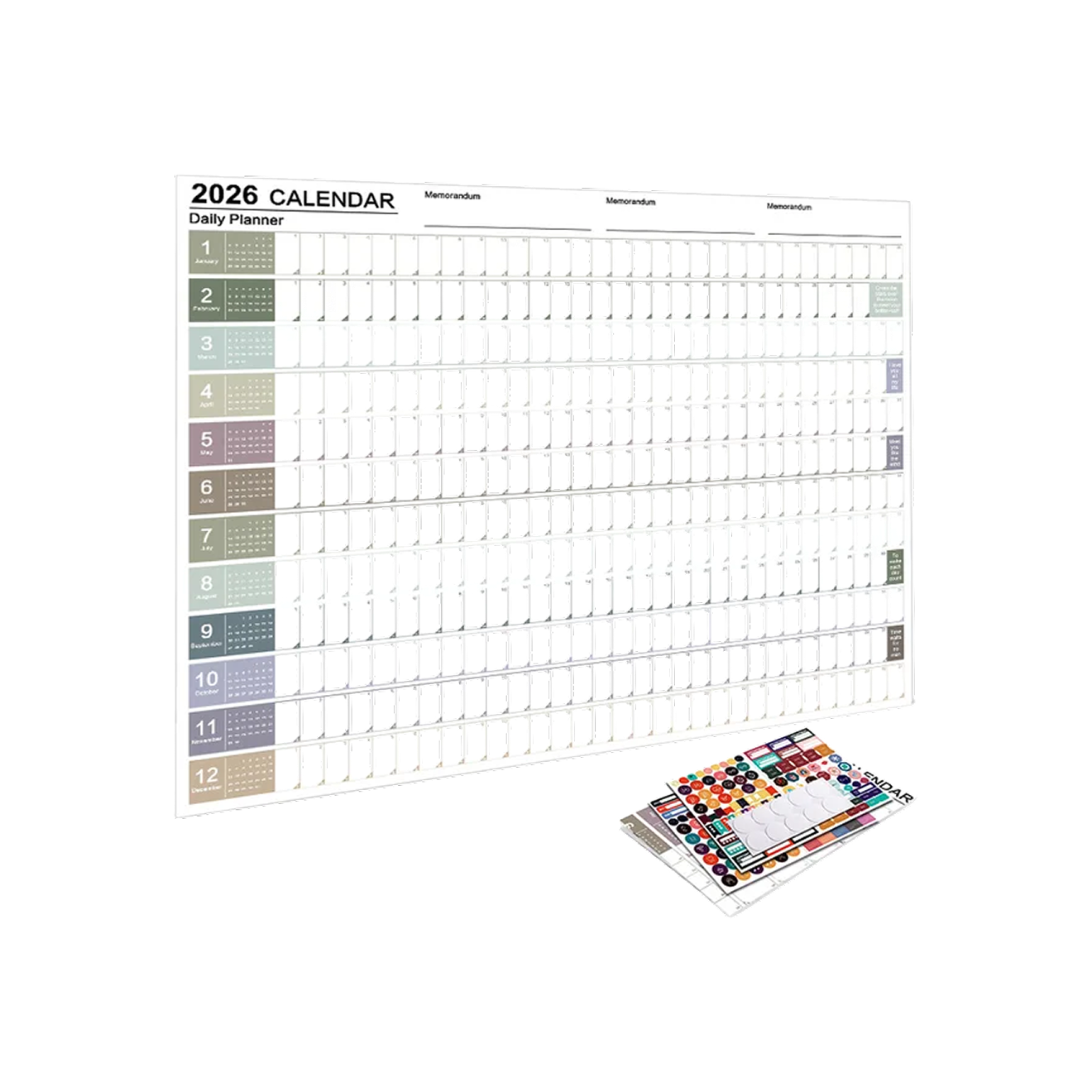 Календарь-планер в виде настенного плаката не имеет никакого смысла без входящего в набор пакета наклеек — ими предполагается заполнять дни и недели будущего года, чтобы сразу видеть, что вас ждет: семейные торжества, поездки, рабочие планы