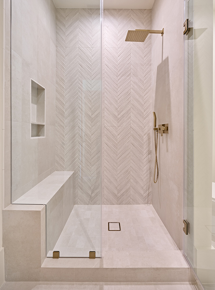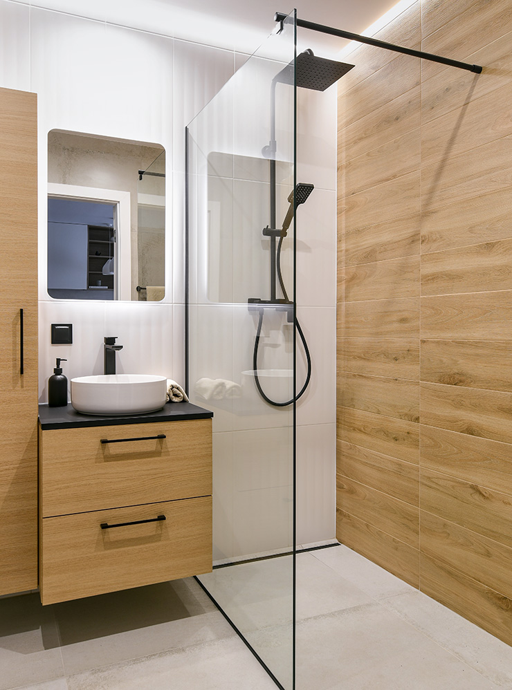 Выбор формата плитки зависит от дизайна. Сейчас в моде мелкоформатная узкая прямоугольная плитка, но ее сложнее и дольше укладывать. Такая плитка хорошо подходит для маленьких помещений, а на большой площади она начинает рябить. Широкоформатный керамогранит берут для просторных ванных комнат, потому что в маленькой сложнее сделать красивые симметричные швы и будет много обрези.