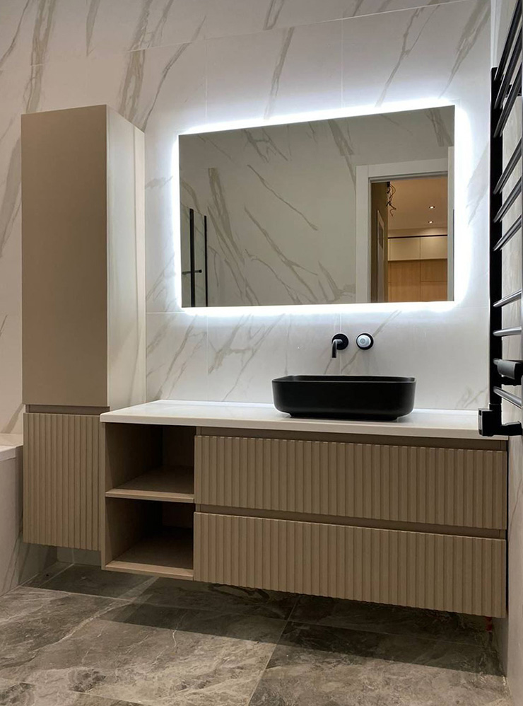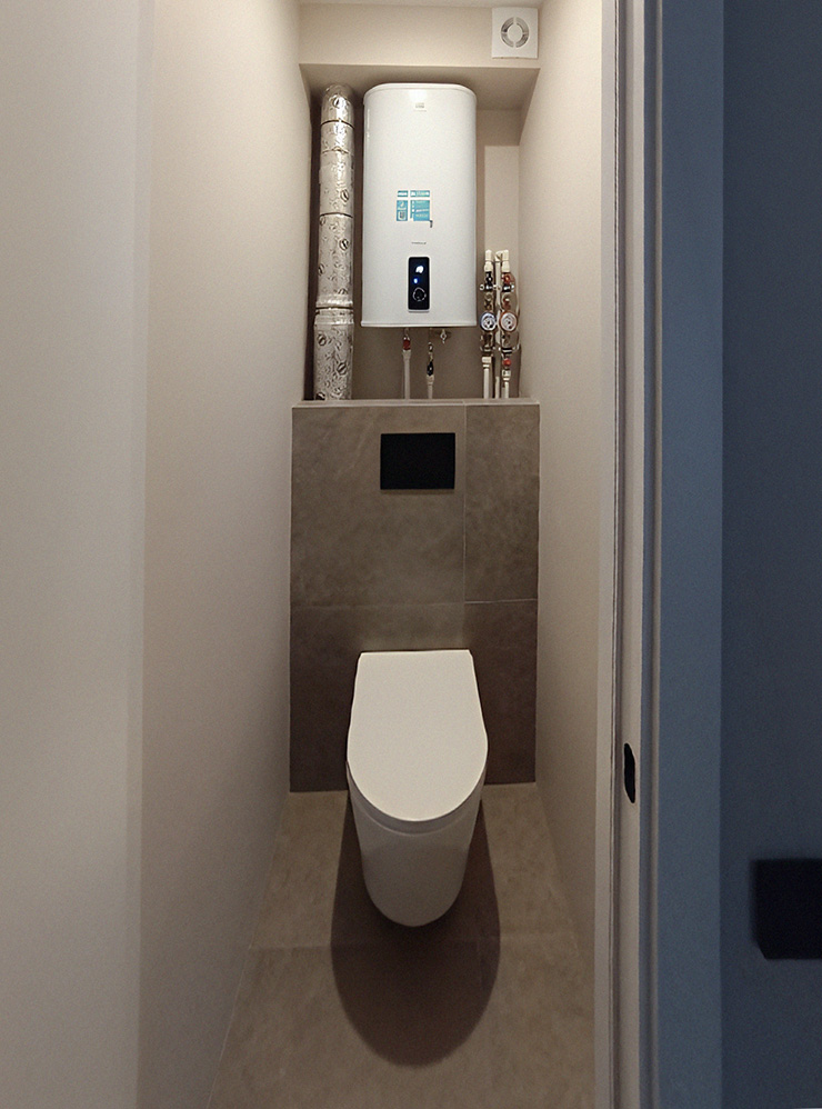 - Сантехника и приборы. На этом этапе устанавливают унитаз, раковины и прочую сантехнику, монтируют электрический полотенцесушитель, подключают систему протечки и климатическую технику.