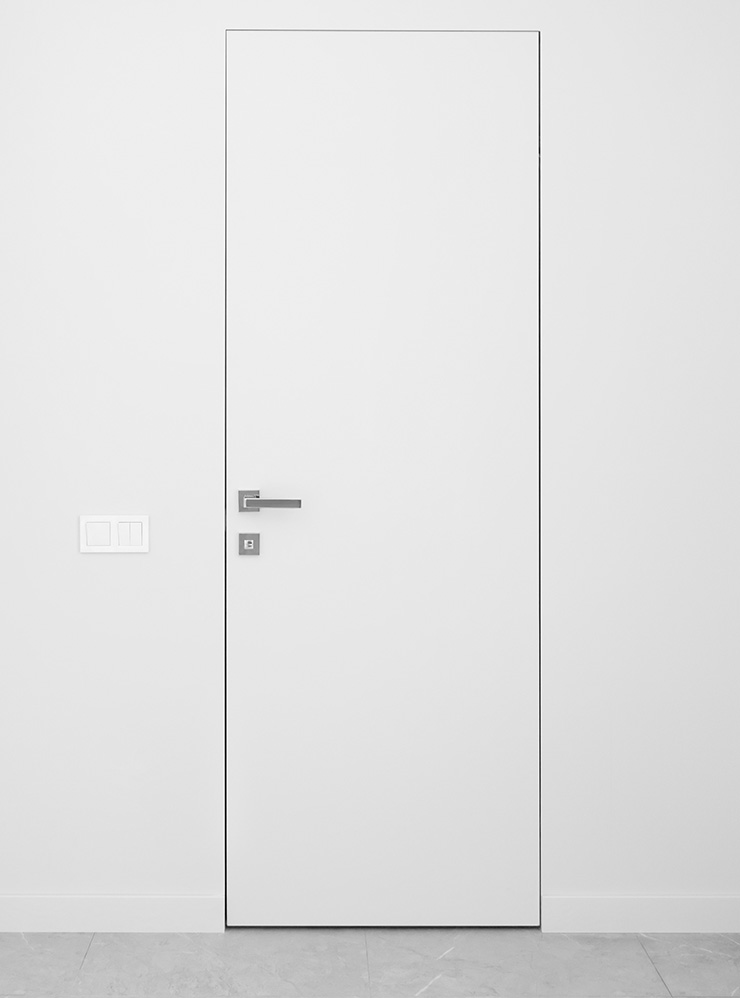 - Скрытого монтажа — без выраженного короба, откосов и наличников. Полотно почти сливается со стеной, и часто его отделывают так же, как остальную поверхность. Двери скрытого монтажа выглядят стильно, но тоже различаются по материалам, а следовательно — по уровню звукоизоляции.