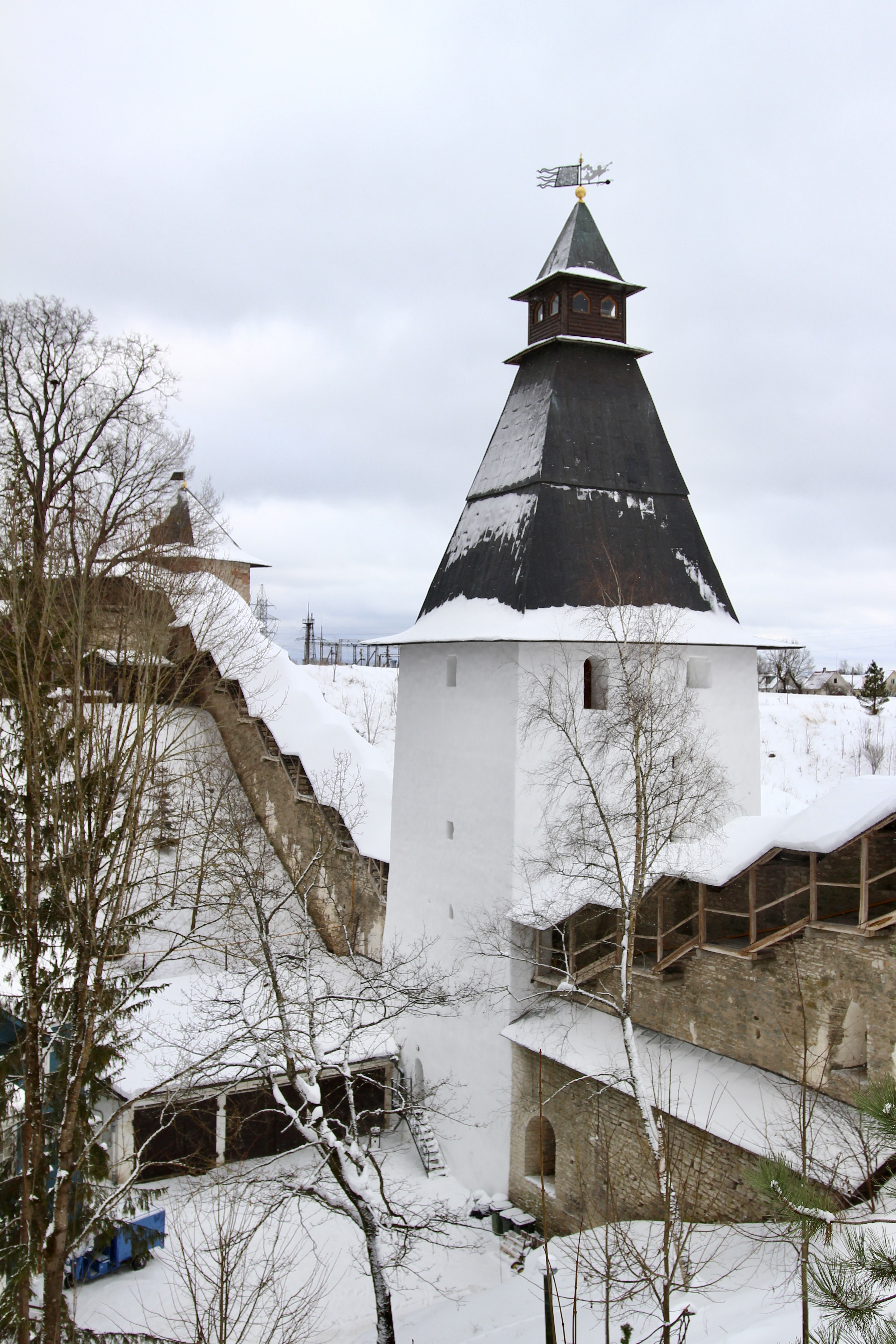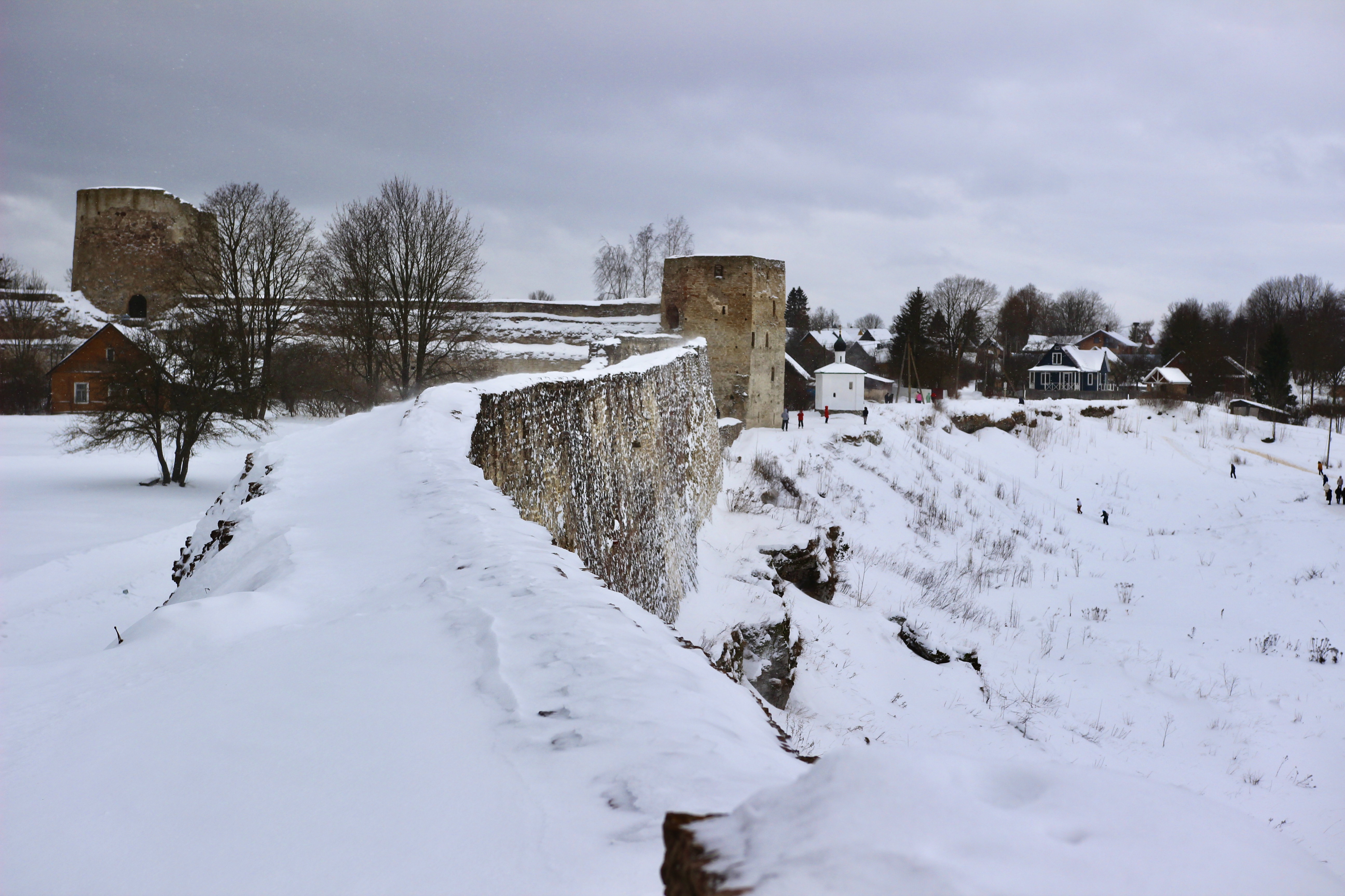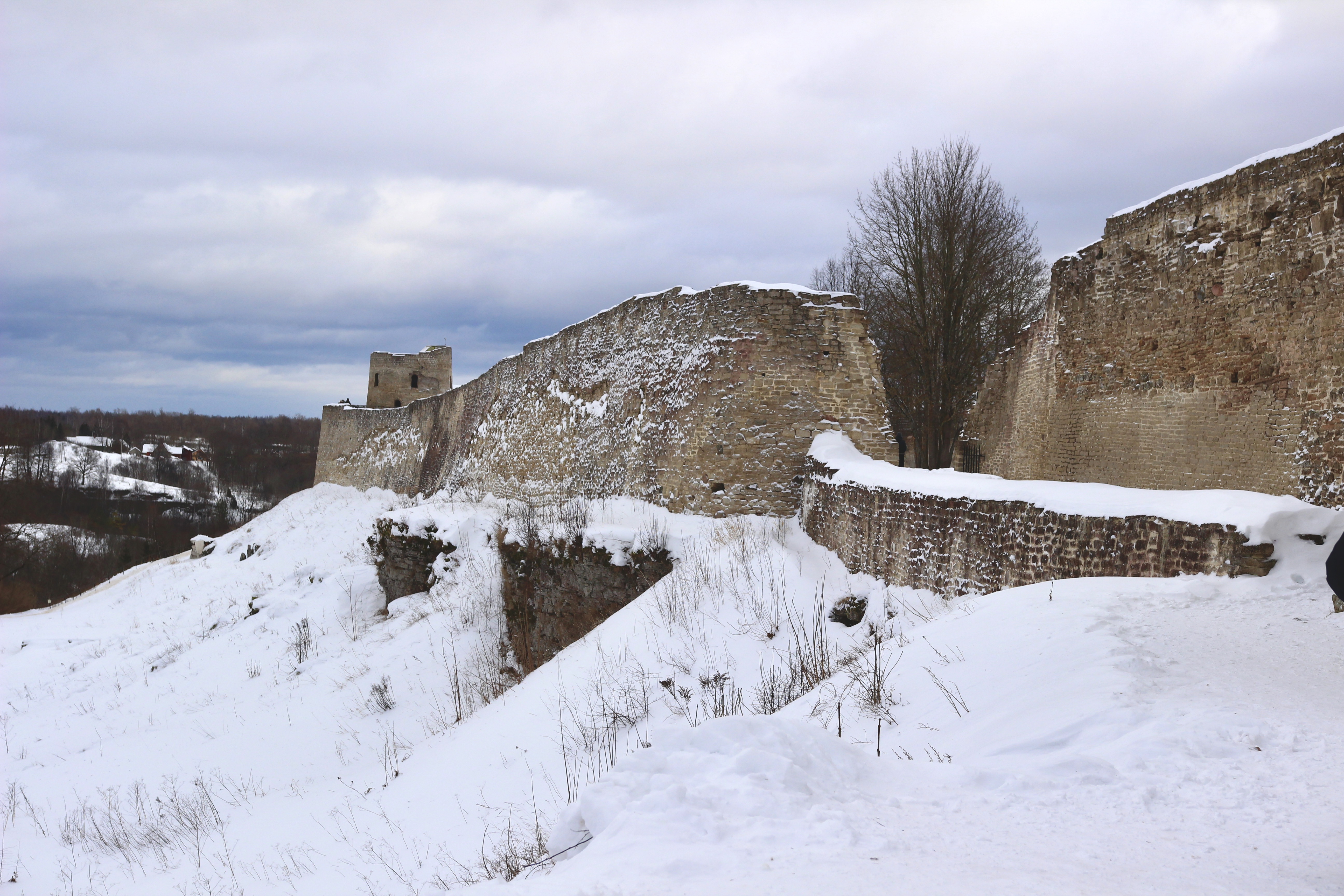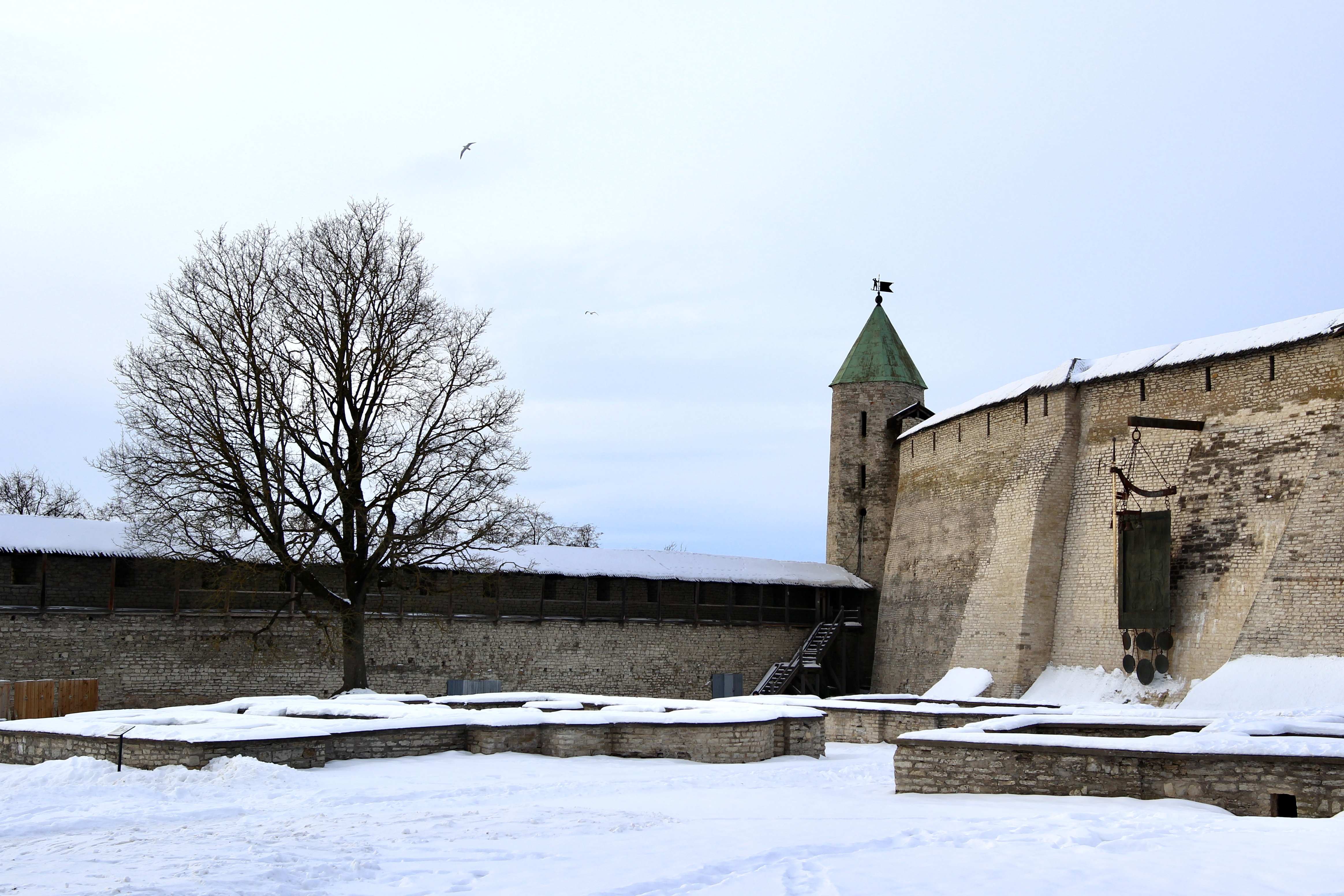 Крепость производит сильное впечатление, особенно когда поднимаешься на стены и смотришь на заснеженные просторы. Мы попали в ветреную погоду, и при взгляде вдаль казалось, что вот-вот из-за снежной пелены навстречу двинется армия ливонских рыцарей в белых плащах.