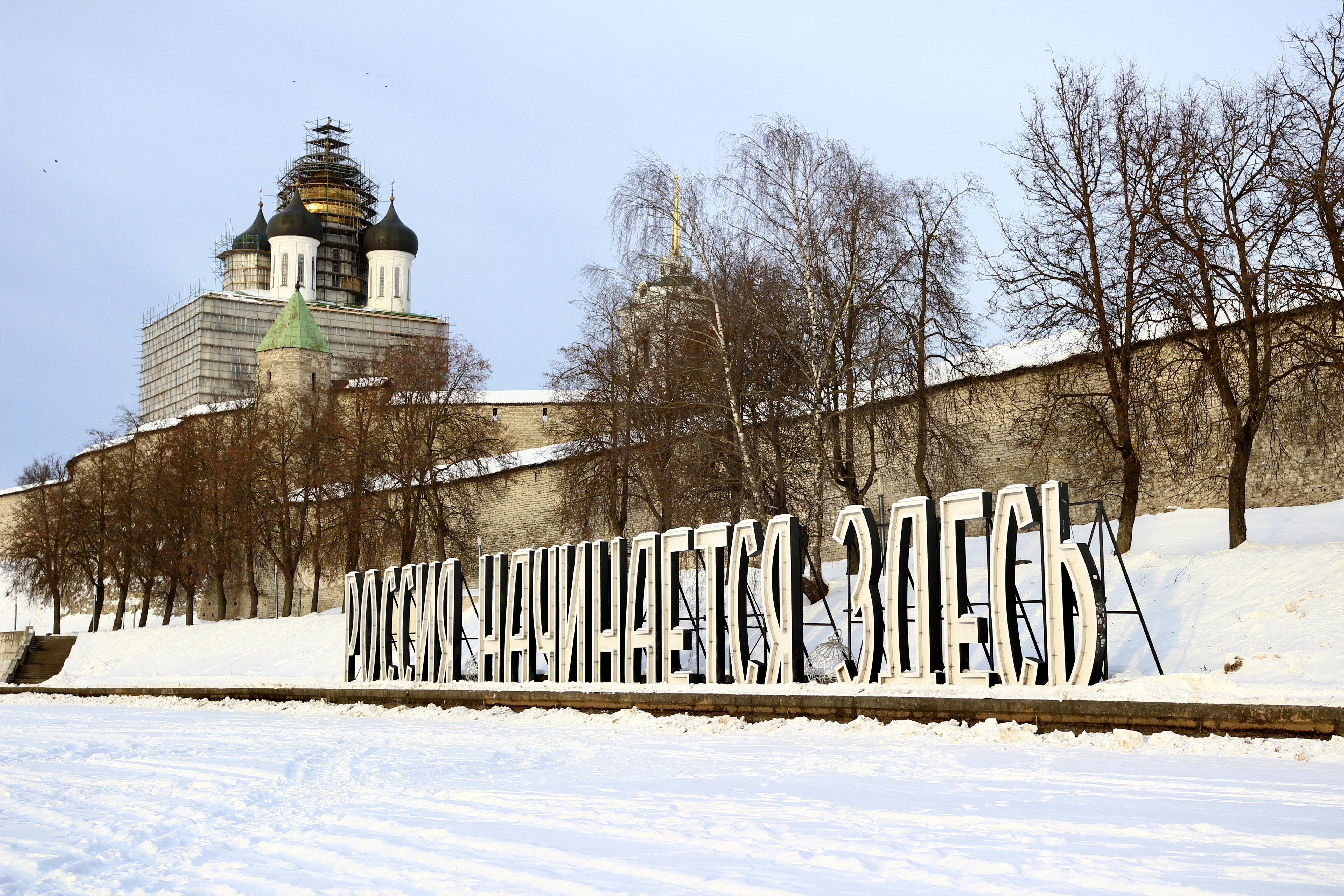 После заселения первым делом отправляемся на набережную, к знаменитой инсталляции «Россия начинается здесь», расположенной прямо под стенами Псковского кремля, или Крома. На льду реки Великой местным, кажется, гораздо комфортнее находиться, чем на набережной — и мы спускаемся к ним.