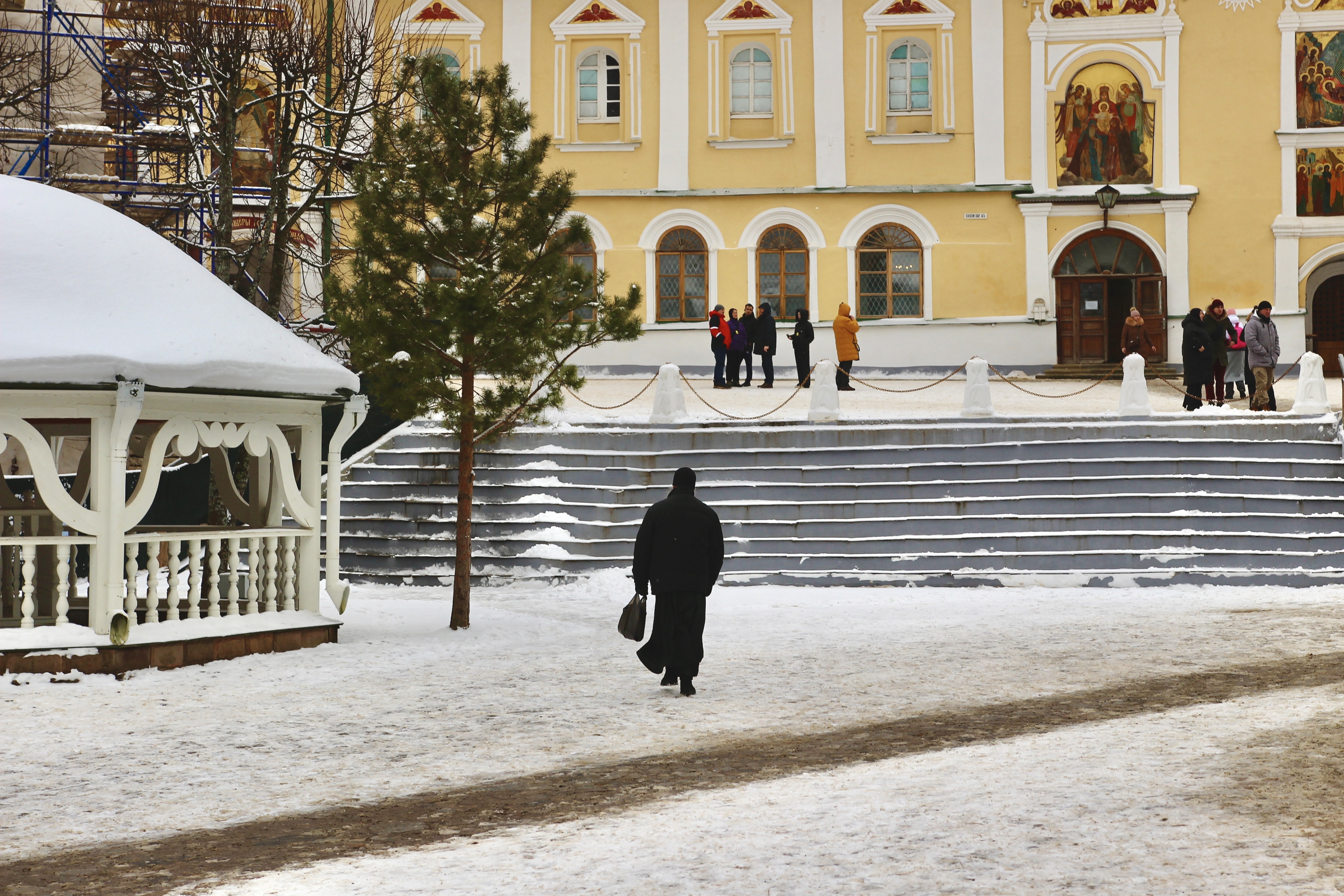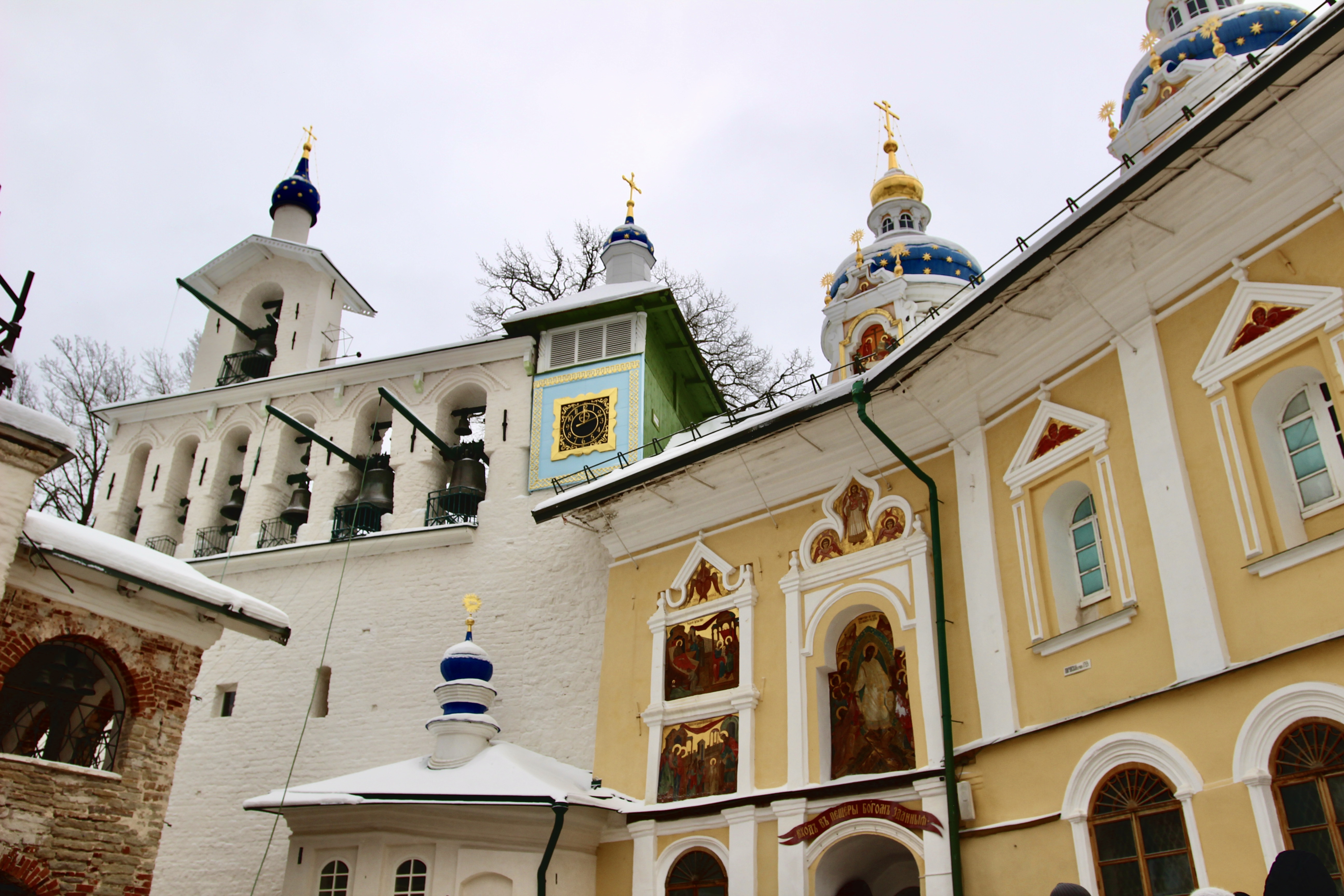 Позавтракали в кофейне Kohvik, а заодно переждали метель. Из окон заведения открывается вид на главную площадь города и краснокирпичную водонапорную башню. От кофейни 5 минут ходьбы до главной достопримечательности — мужского Свято-Успенского монастыря. Он расположен на месте входа в пещеры, которые служат важным местом для паломников со всего мира. Обитель была основана в 1473 г. после освящения пещерной церкви Успения Богородицы. Нам не удалось попасть в знаменитые Дальние, или «Богом зданные», пещеры, но и снаружи есть на что полюбоваться.