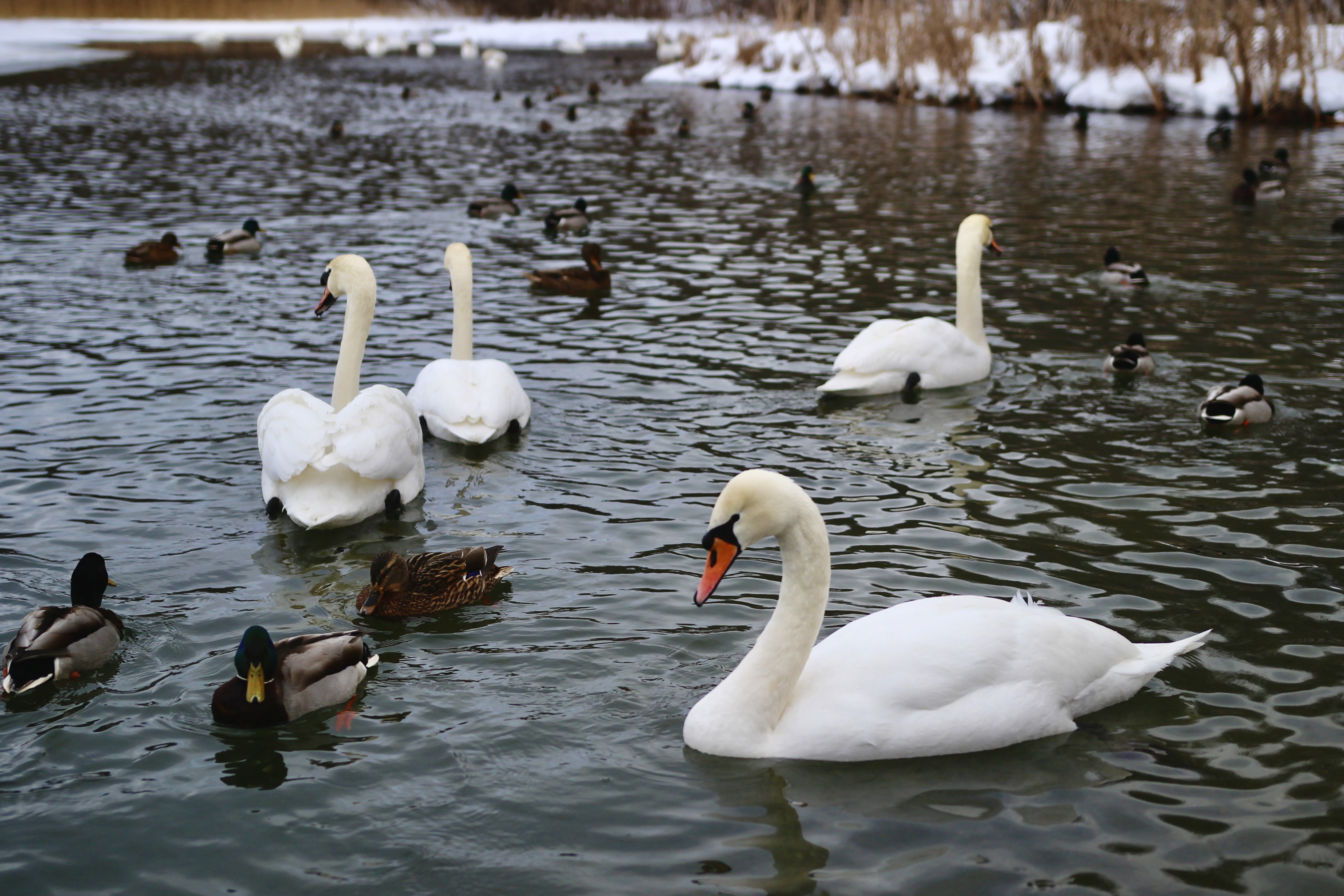 У нас оставался час до автобуса в Псков, и мы спустились к Словенским ключам (их 12 штук, как апостолов), а заодно полюбовались великолепными белыми лебедями, которые не покидают этих мест даже зимой из-за незамерзающей воды.