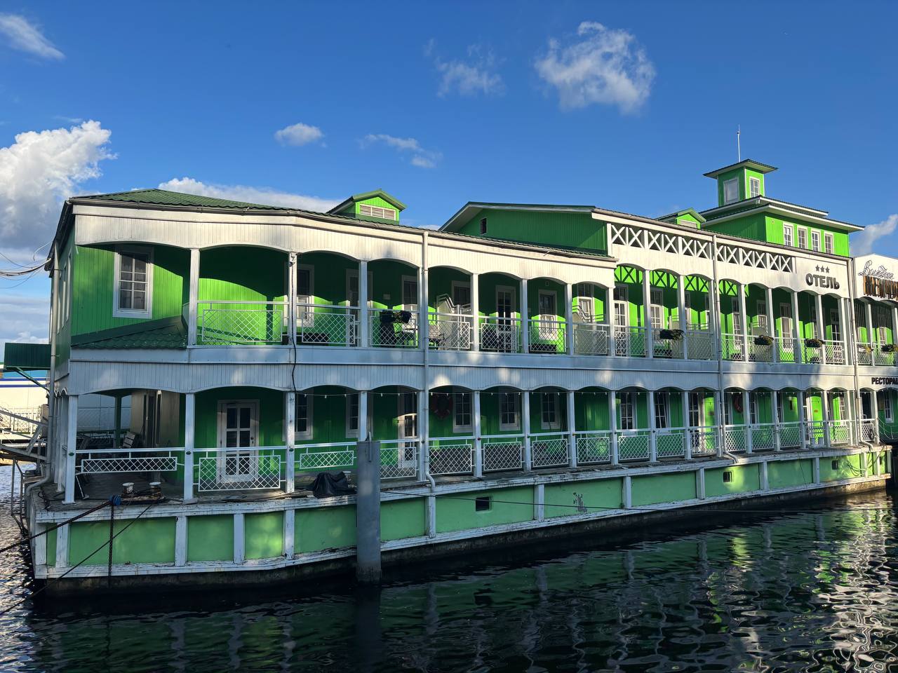 В первый день мы отправились на корабле по Волге, послушали историю города, но сами виды нас мало впечталили, мы плыли за город к Толгскому монастырю, а по городу мало прошли, но увидели стрелку и Успенский собор, набережную. Мне понравился старинный дебаркадер зеленого цвета, используемый как ресторан и отель.