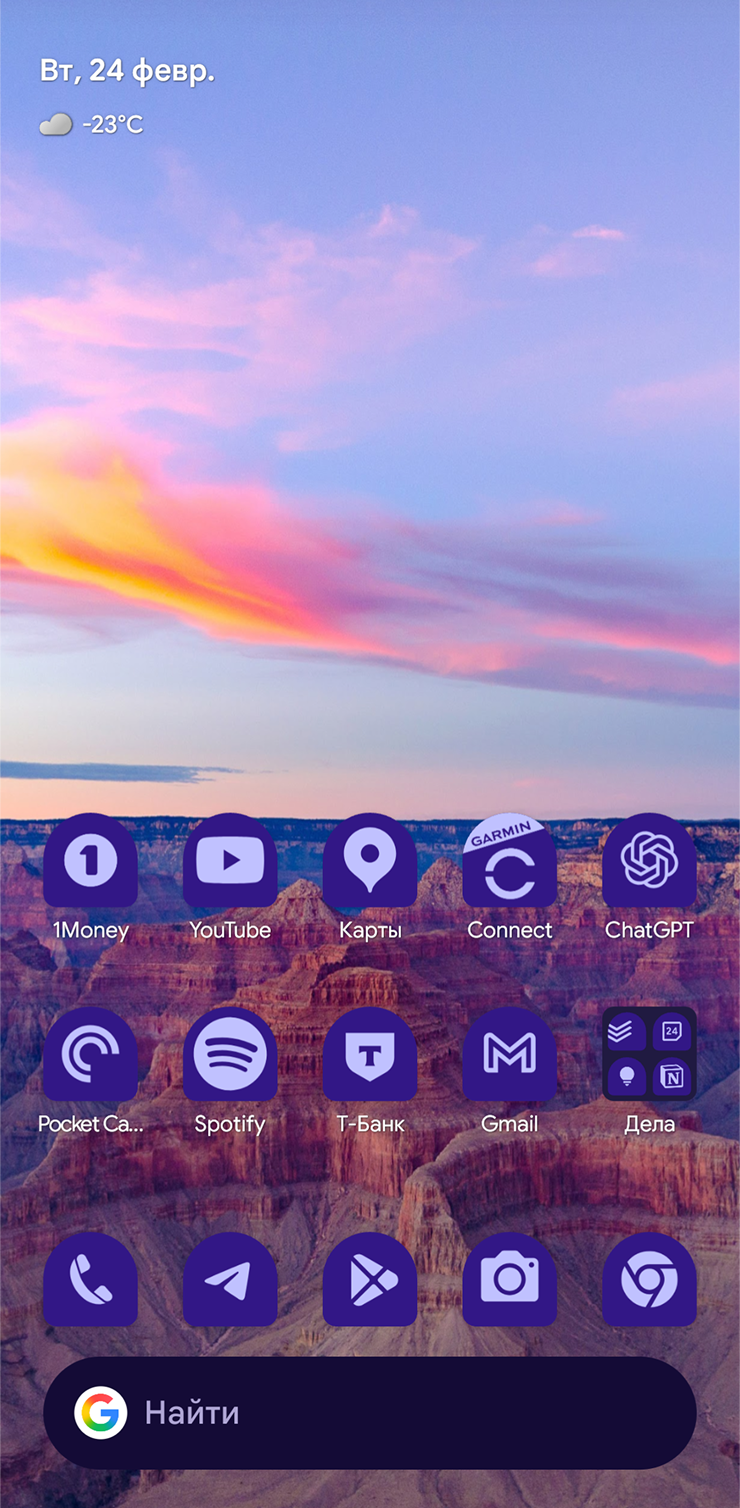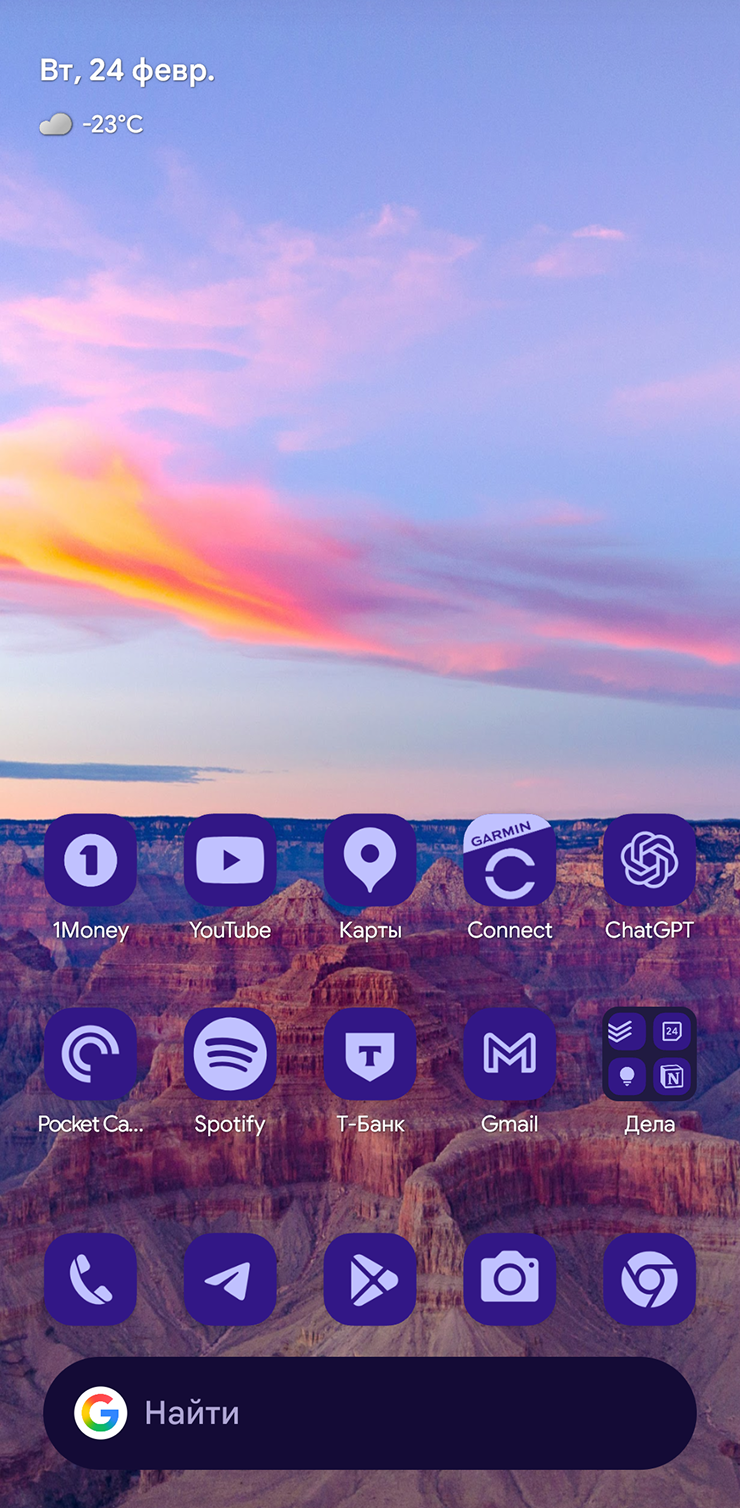 Система инвертирует цвет фона, не трогая изображения и управляющие элементы интерфейса. В целом получается неплохо, хотя промахи случаются: например, при входе в приложение Т-Банка затемняется фирменный желтый. Также «расширенная» темная тема может не сработать с программами, которые написаны с использованием кросс-платформенных технологий.