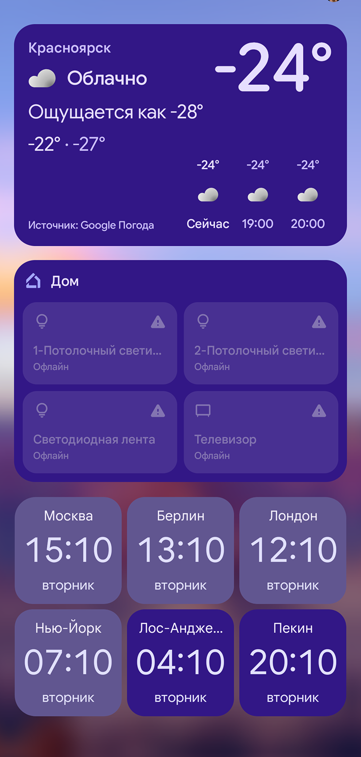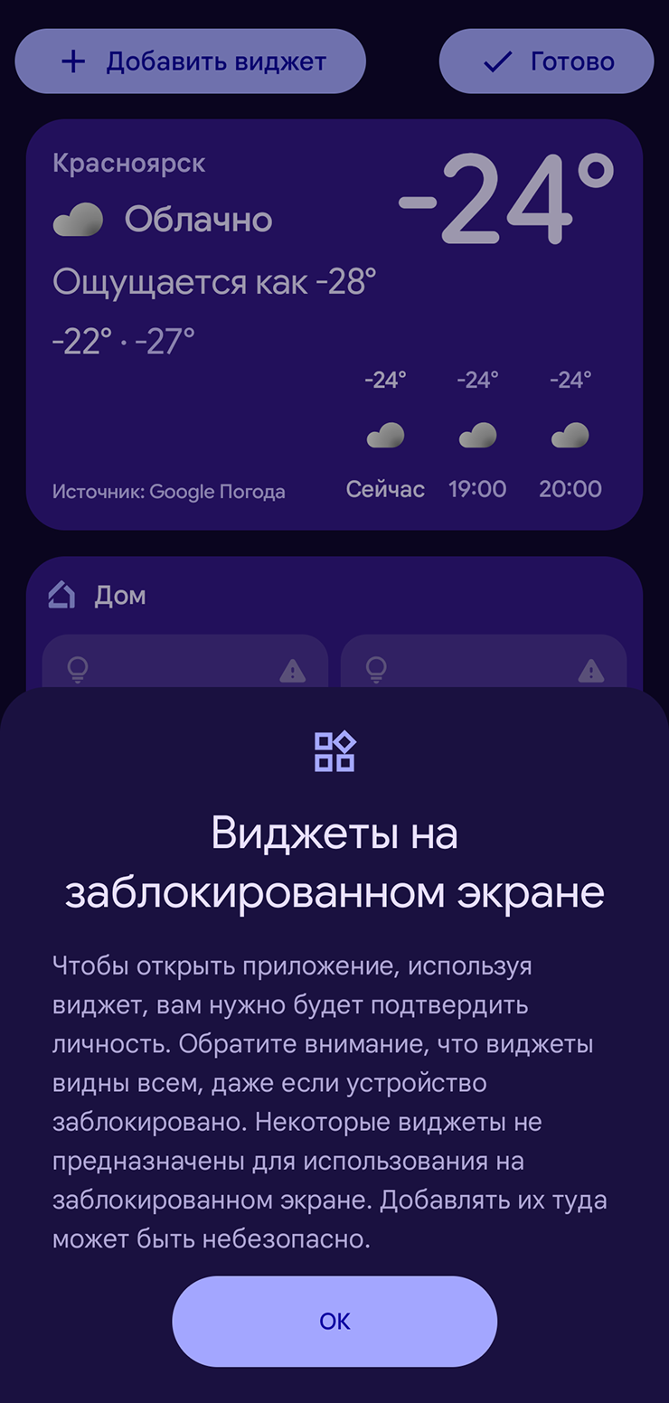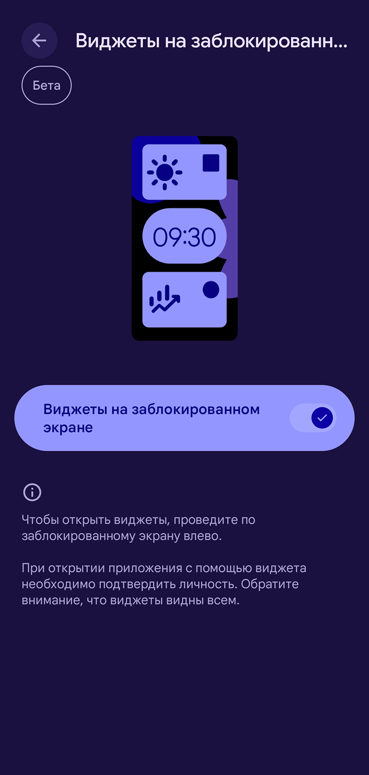 На этом экране можно размещать любые виджеты для рабочего стола. Просмотр содержимого доступен без разблокировки, поэтому сюда не стоит ставить модули приложений с чувствительной информацией. Тап по виджету вызовет запуск соответствующей программы — уже с необходимостью аутентификации по биометрии или пину.