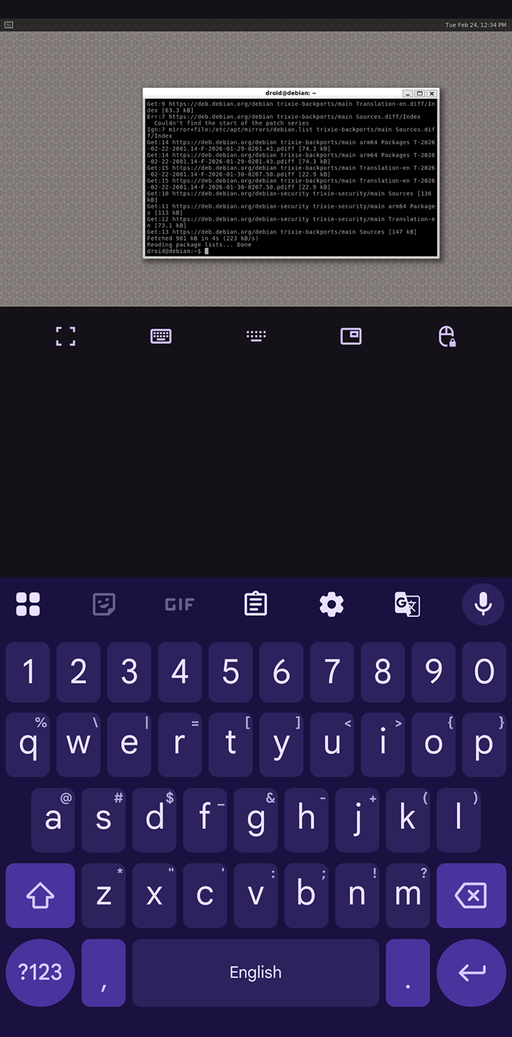 Графический интерфейс в эмуляторе Linux. В Android 16 появилась опция «Среда разработки Linux», которая запускает на смартфоне виртуальную машину с операционной системой Debian. Поначалу взаимодействовать с Linux можно было только в консольном режиме, но в обновлении Android 16 QPR2 появилась поддержка графического.