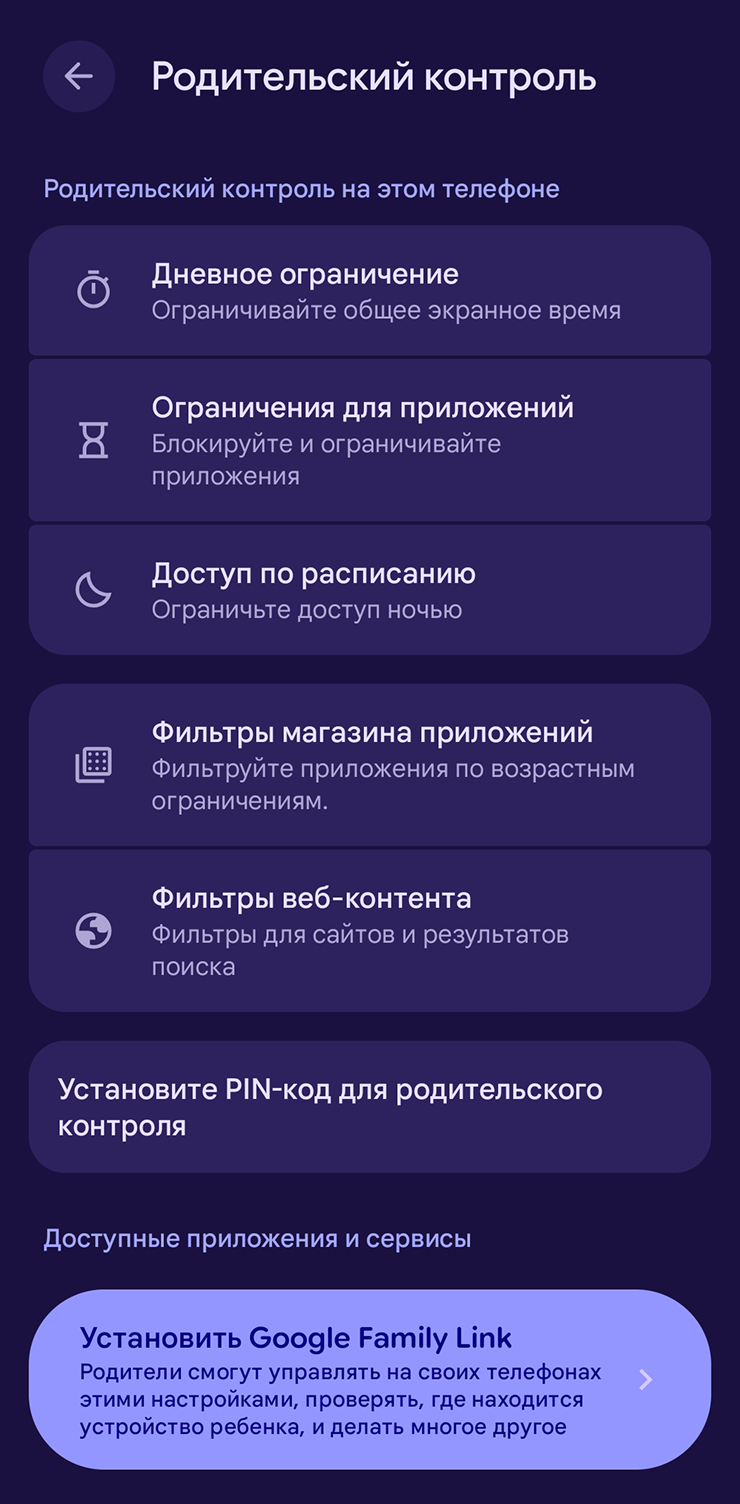 Родительский контроль. Раньше, чтобы настроить смартфон для использования детьми, приходилось скачивать приложение Google Family Link. Теперь базовые возможности родительского контроля встроили прямо в операционную систему.